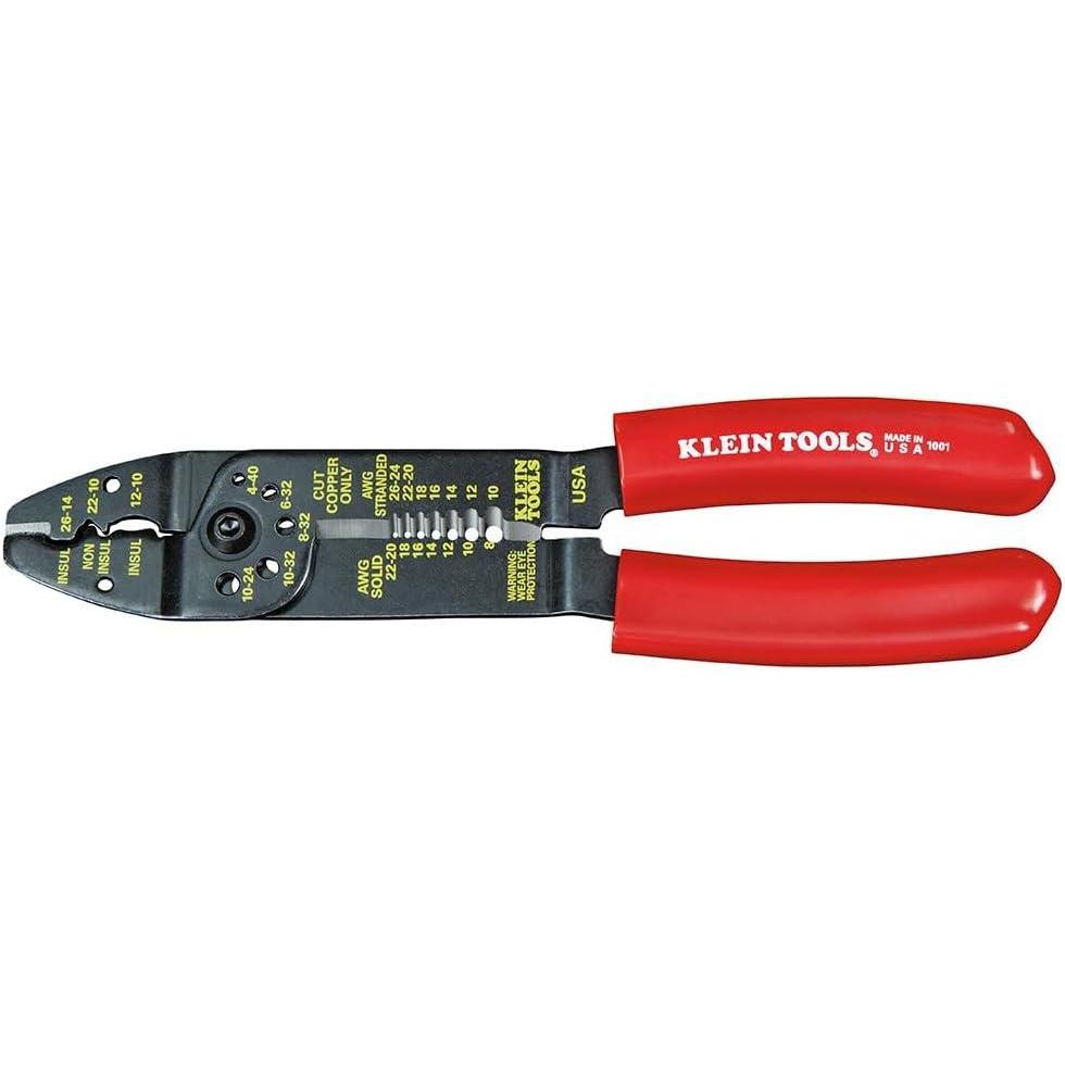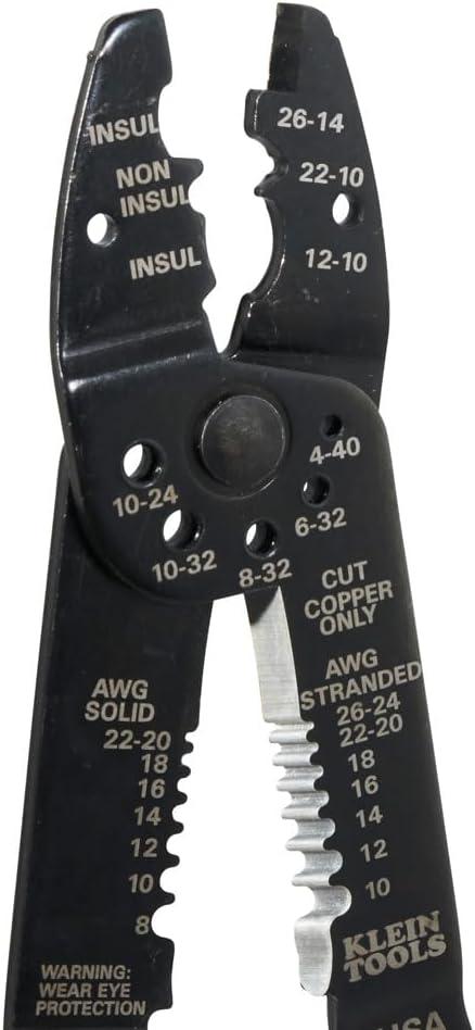 The Klein Tools Wire Stripper Multi-Tool cuts, crimps, and strips solid and stranded wire and shears bolts. Two cutting blades for 8-22 AWG solid and 10-26 AWG stranded wire. The crimping function handles 7-8 mm insulated and non-insulated terminals, lugs, and splices. For more than 160 years, Klein Tools has manufactured premium-quality, professional-grade hand tools that deliver the performance, durability and precision needed to get the job done right. Our family of engineers, workers and craftsman continue to put six generations of expertise into every tool we create by using only the highest quality materials, superior workmanship, and keeping manufacturing as close to home as we can. Klein isn't just the name of our company, it's also our family name. And since we're an American company that's family-owned and family-run, you know you can count on us to be here tomorrow. Klein Tools doesn't just make great products, we make great products that stand up to the demands of the professionals who use them every day … Since 1857.