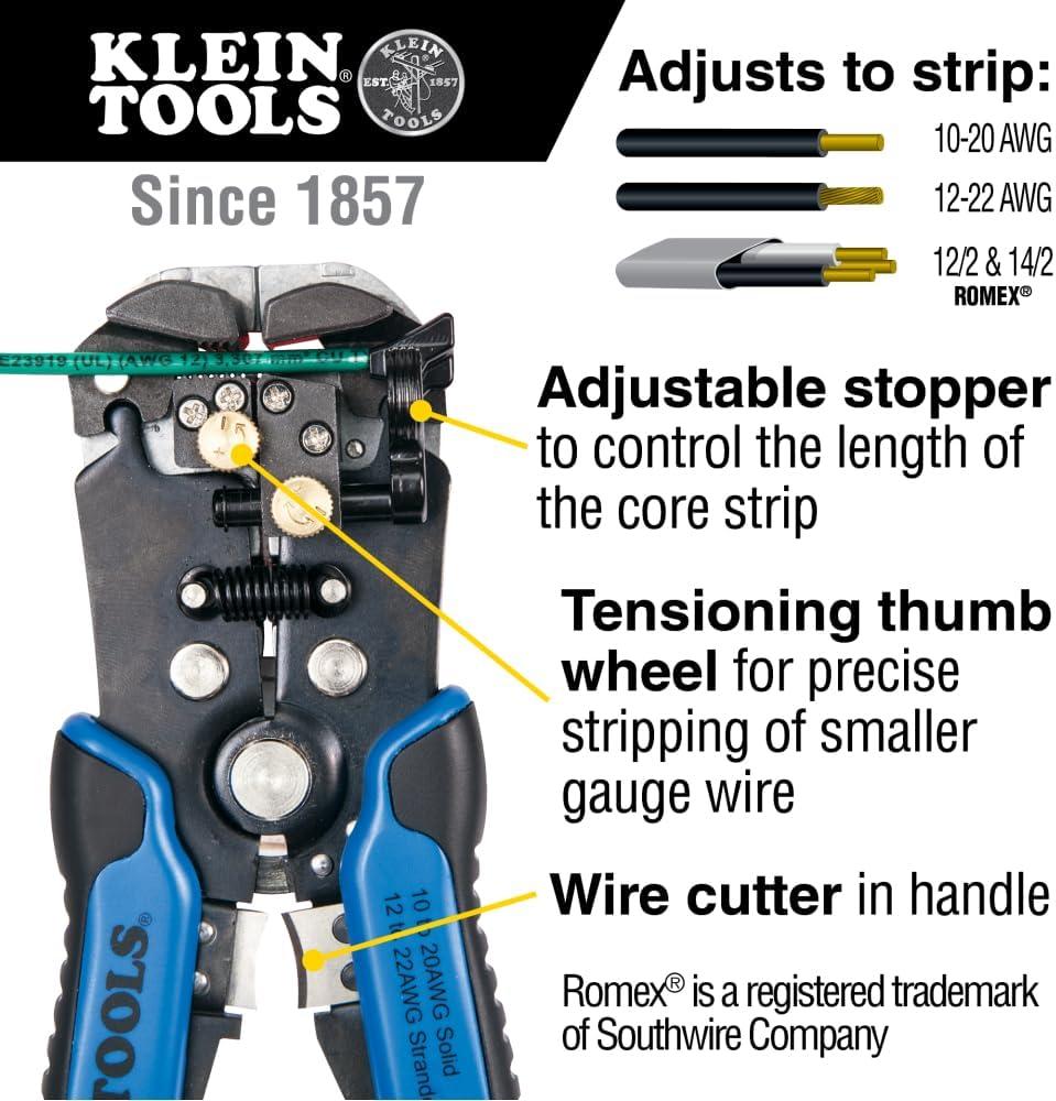 The Klein Tools Self-Adjusting Wire Stripper / Cutter takes the guesswork out of stripping solid, stranded, and Romex wire. As the name suggests, this tool features a self-adjusting stripping head for quick, precise wire stripping. It's especially useful in panels and other places where multiple types and sizes of wire are present. Great for HVAC applications. For more than 160 years, Klein Tools has manufactured premium-quality, professional-grade hand tools that deliver the performance, durability and precision needed to get the job done right. Our family of engineers, workers and craftsman continue to put six generations of expertise into every tool we create by using only the highest quality materials, superior workmanship, and keeping manufacturing as close to home as we can. Klein isn't just the name of our company, it's also our family name. And since we're an American company that's family-owned and family-run, you know you can count on us to be here tomorrow. Klein Tools doesn't just make great products, we make great products that stand up to the demands of the professionals who use them every day … Since 1857.