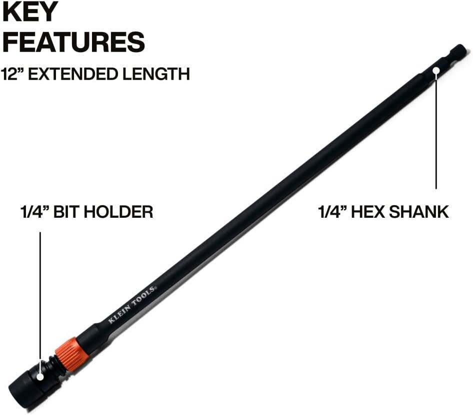 Klein Tools 12-Inch Dual-Lock Impact Extension is engineered for professionals who need extended reach without sacrificing bit security. Its dual locking system combines quick-release and twist lock for high-torque tasks. The impact rated 1/4-Inch hex shank stands up to the demands of impact drivers while remaining compatible with standard drills. Compatible with all 1/4-Inch bits, it's a must-have for professionals tackling projects in tight spaces. For more than 160 years, Klein Tools has manufactured premium-quality, professional-grade hand tools that deliver the performance, durability and precision needed to get the job done right. Our family of engineers, workers and craftsman continue to put six generations of expertise into every tool we create by using only the highest quality materials, superior workmanship, and keeping manufacturing as close to home as we can. Klein isn't just the name of our company, it's also our family name. And since we're an American company that's family-owned and family-run, you know you can count on us to be here tomorrow. Klein Tools doesn't just make great products, we make great products that stand up to the demands of the professionals who use them every day … Since 1857.