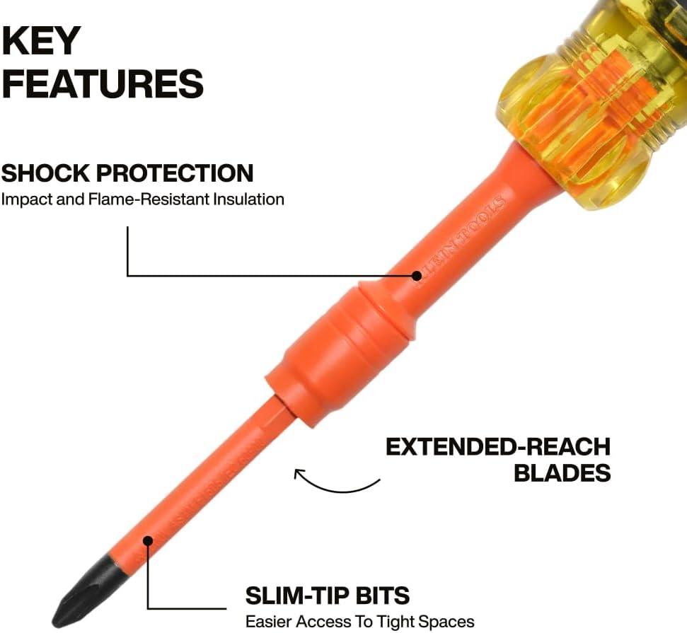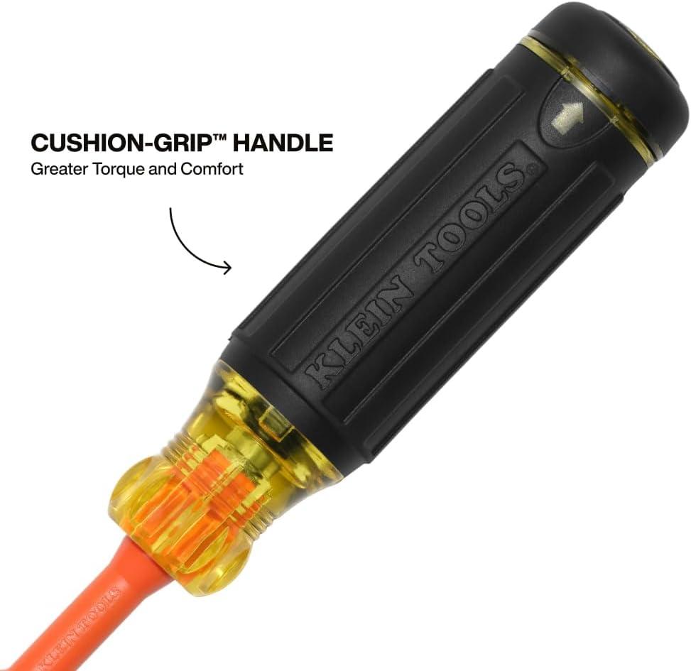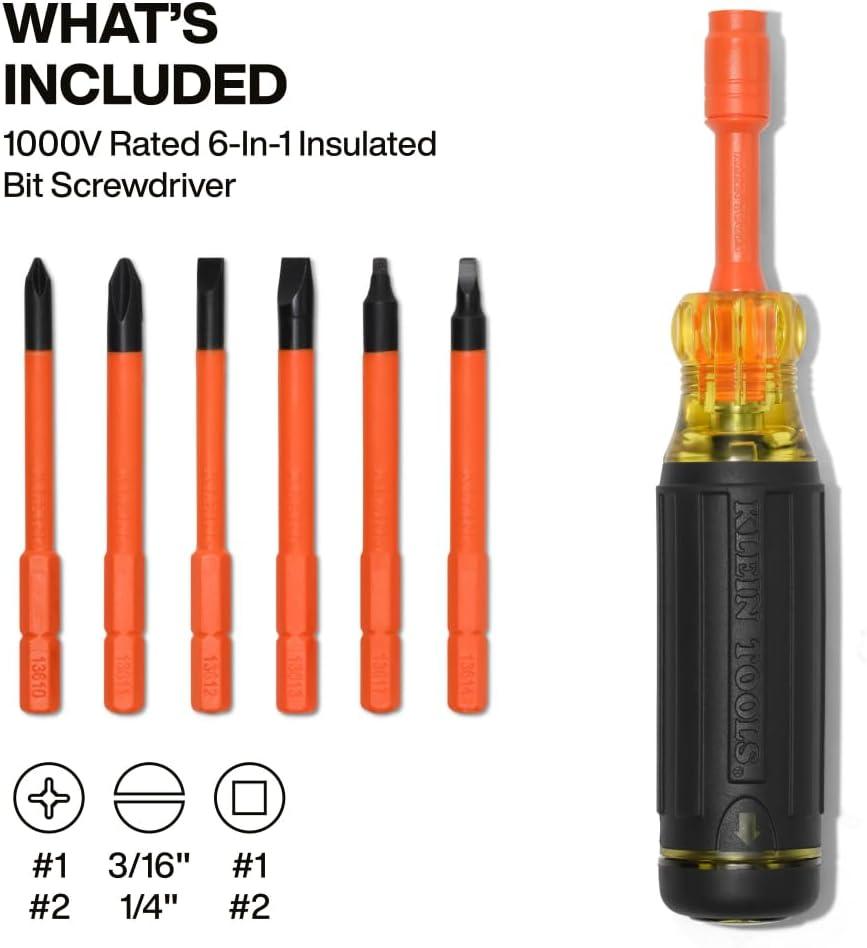Klein Tools 6-in-1 Insulated Multi-Bit Screwdriver features 1000V rated insulation meeting or exceeding ASTM F1505 standards. Auto-locking collar secures bits while slim-tip geometry enables access to tight terminal blocks and confined electrical spaces. Includes six insulated bits with in-handle storage and a Cushion-Grip handle to provide superior torque and comfort for electrical applications requiring safety and precision. For more than 160 years, Klein Tools has manufactured premium-quality, professional-grade hand tools that deliver the performance, durability and precision needed to get the job done right. Our family of engineers, workers and craftsman continue to put six generations of expertise into every tool we create by using only the highest quality materials, superior workmanship, and keeping manufacturing as close to home as we can. Klein isn't just the name of our company, it's also our family name. And since we're an American company that's family-owned and family-run, you know you can count on us to be here tomorrow. Klein Tools doesn't just make great products, we make great products that stand up to the demands of the professionals who use them every day … Since 1857.
