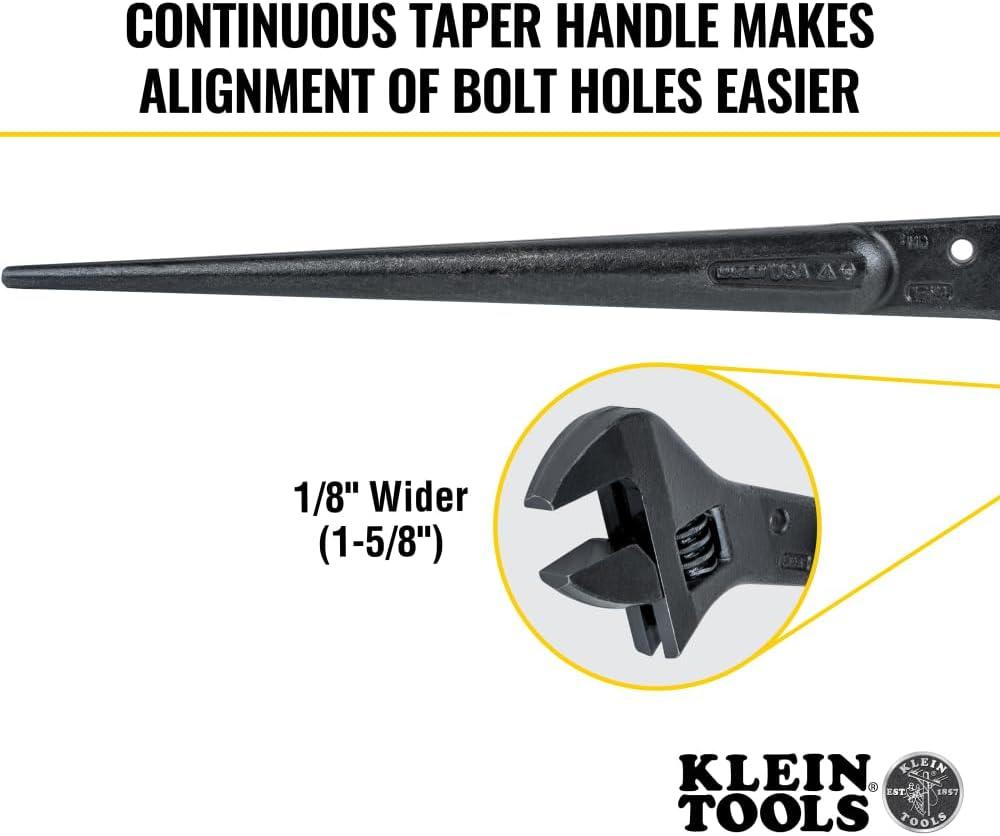 There is no need to carry several fixed-size wrenches when you have a Klein Tools' Adjustable-Head Construction Wrench. The extra-wide jaw fits nuts and bolts up to 1-Inch. Made in the USA and forged from durable, select alloy steel. The continuous-taper handle helps align bolt and rivet holes. For more than 160 years, Klein Tools has manufactured premium-quality, professional-grade hand tools that deliver the performance, durability and precision needed to get the job done right. Our family of engineers, workers and craftsman continue to put six generations of expertise into every tool we create by using only the highest quality materials, superior workmanship, and keeping manufacturing as close to home as we can. Klein isn't just the name of our company, it's also our family name. And since we're an American company that's family-owned and family-run, you know you can count on us to be here tomorrow. Klein Tools doesn't just make great products, we make great products that stand up to the demands of the professionals who use them every day … Since 1857.