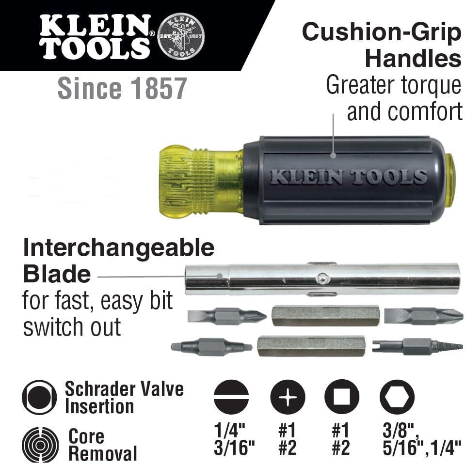 With Klein Tools 11-in-1 multi-bit screwdriver carry fewer tools in your bag. This screwdriver / nut driver comes with a Schrader bit, 2 Phillips bits, 2 Slotted bits, 2 Square bits, and 3 Nut Driver sizes. Each of the 11 tips is blast finished to provide a firm hold and reduce cam out. It also has Klein's Cushion-Grip handle for greater torque and comfort. For more than 160 years, Klein Tools has manufactured premium-quality, professional-grade hand tools that deliver the performance, durability and precision needed to get the job done right. Our family of engineers, workers and craftsman continue to put six generations of expertise into every tool we create by using only the highest quality materials, superior workmanship, and keeping manufacturing as close to home as we can. Klein isn't just the name of our company, it's also our family name. And since we're an American company that's family-owned and family-run, you know you can count on us to be here tomorrow. Klein Tools doesn't just make great products, we make great products that stand up to the demands of the professionals who use them every day … Since 1857.