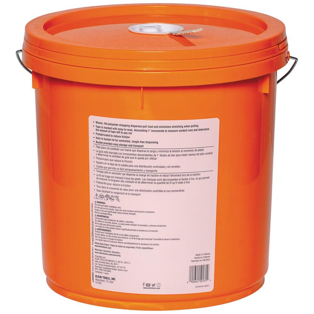 The Klein Tools 1250-Pound tensile strength conduit measuring pull tape is a durable, flat polyester strapping that disperses pull load and minimizes stretching when pulling. The tape is marked with descending 1-Foot increments to measure conduit runs. Tape is pre-lubricated to reduce friction and comes in a bucket with a hole in the lid for tangle-free dispensing. Pull Tape is also available in a variety of tensile strengths and lengths. For more than 160 years, Klein Tools has manufactured premium-quality, professional-grade hand tools that deliver the performance, durability and precision needed to get the job done right. Our family of engineers, workers and craftsman continue to put six generations of expertise into every tool we create by using only the highest quality materials, superior workmanship, and keeping manufacturing as close to home as we can. Klein isn't just the name of our company, it's also our family name. And since we're an American company that's family-owned and family-run, you know you can count on us to be here tomorrow. Klein Tools doesn't just make great products, we make great products that stand up to the demands of the professionals who use them every day … Since 1857.