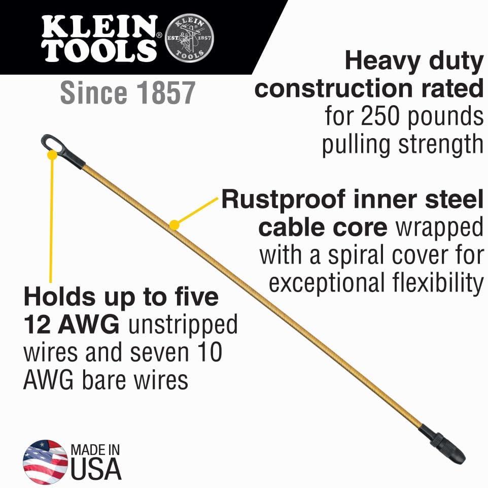 Klein Tools' Flexible Fish Tape Leader makes fishing through tight bends quicker and easier. The heavy-duty construction can withstand up to a 500-pound pull. The high capacity eyelet holds up to five #12 unstripped wires and seven #10 bare wires. For more than 160 years, Klein Tools has manufactured premium-quality, professional-grade hand tools that deliver the performance, durability and precision needed to get the job done right. Our family of engineers, workers and craftsman continue to put six generations of expertise into every tool we create by using only the highest quality materials, superior workmanship, and keeping manufacturing as close to home as we can. Klein isn't just the name of our company, it's also our family name. And since we're an American company that's family-owned and family-run, you know you can count on us to be here tomorrow. Klein Tools doesn't just make great products, we make great products that stand up to the demands of the professionals who use them every day … Since 1857.