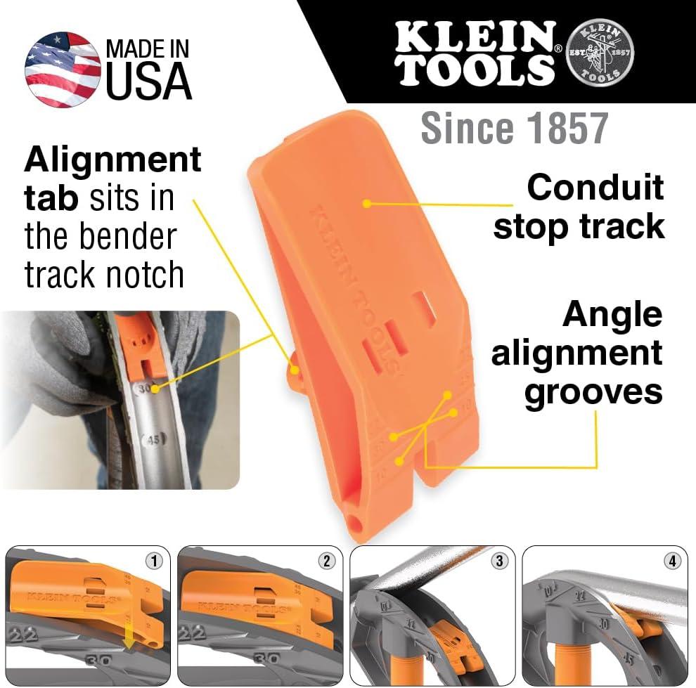 Klein Tools conduit benders with Patent Pending Angle Setter technology allow for quick, accurate bends. When performing repeated bends the Angle Setter will save time on the job. Works for floor or air bends. For more than 160 years, Klein Tools has manufactured premium-quality, professional-grade hand tools that deliver the performance, durability and precision needed to get the job done right. Our family of engineers, workers and craftsman continue to put six generations of expertise into every tool we create by using only the highest quality materials, superior workmanship, and keeping manufacturing as close to home as we can. Klein isn't just the name of our company, it's also our family name. And since we're an American company that's family-owned and family-run, you know you can count on us to be here tomorrow. Klein Tools doesn't just make great products, we make great products that stand up to the demands of the professionals who use them every day … Since 1857.