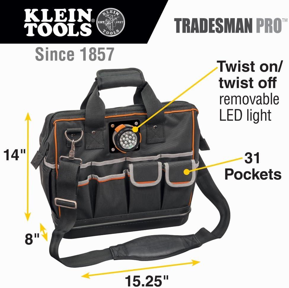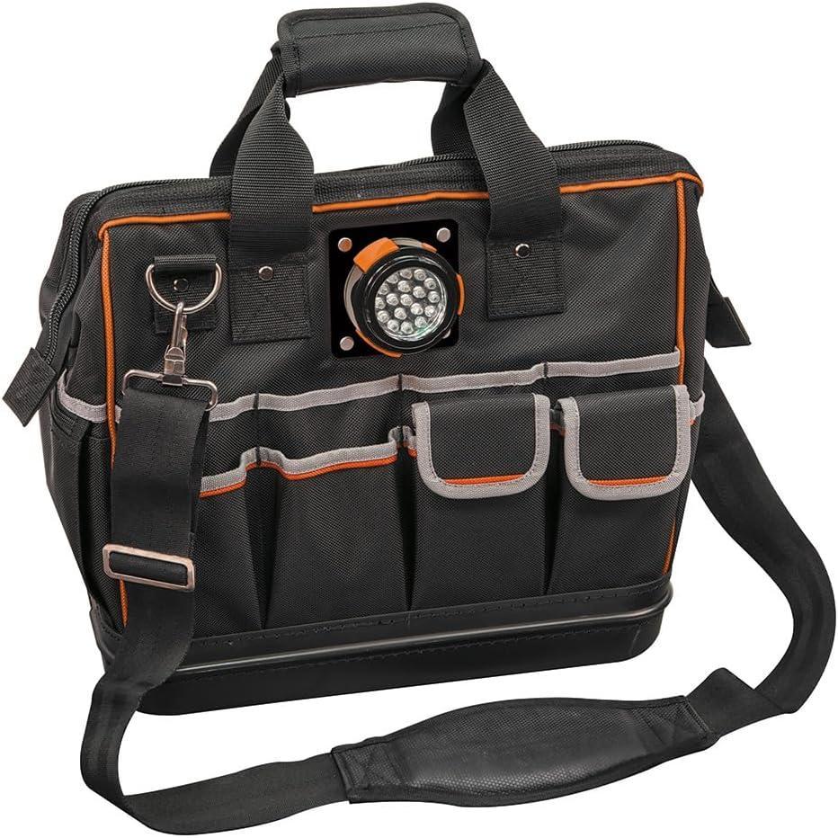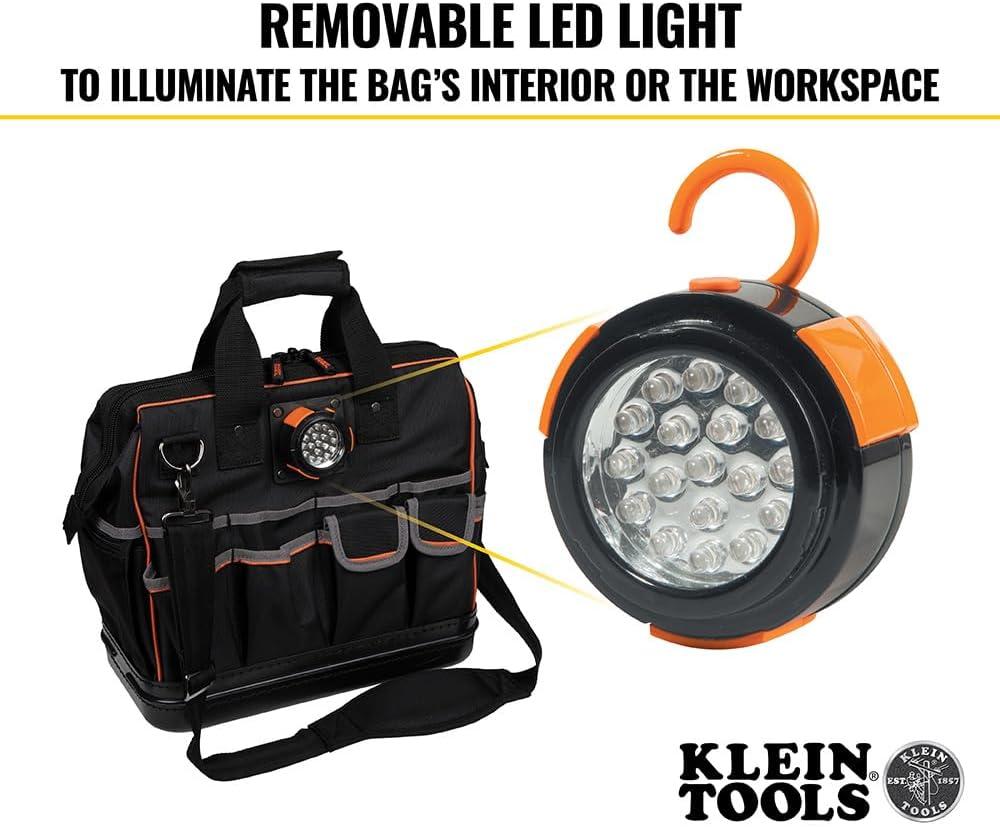 Klein Tools 55431 Tool Bag with Molded Bottom, Padded Shoulder Strap and Lighted Tool Storage with 31 Pockets(Lighted Tool Bag)