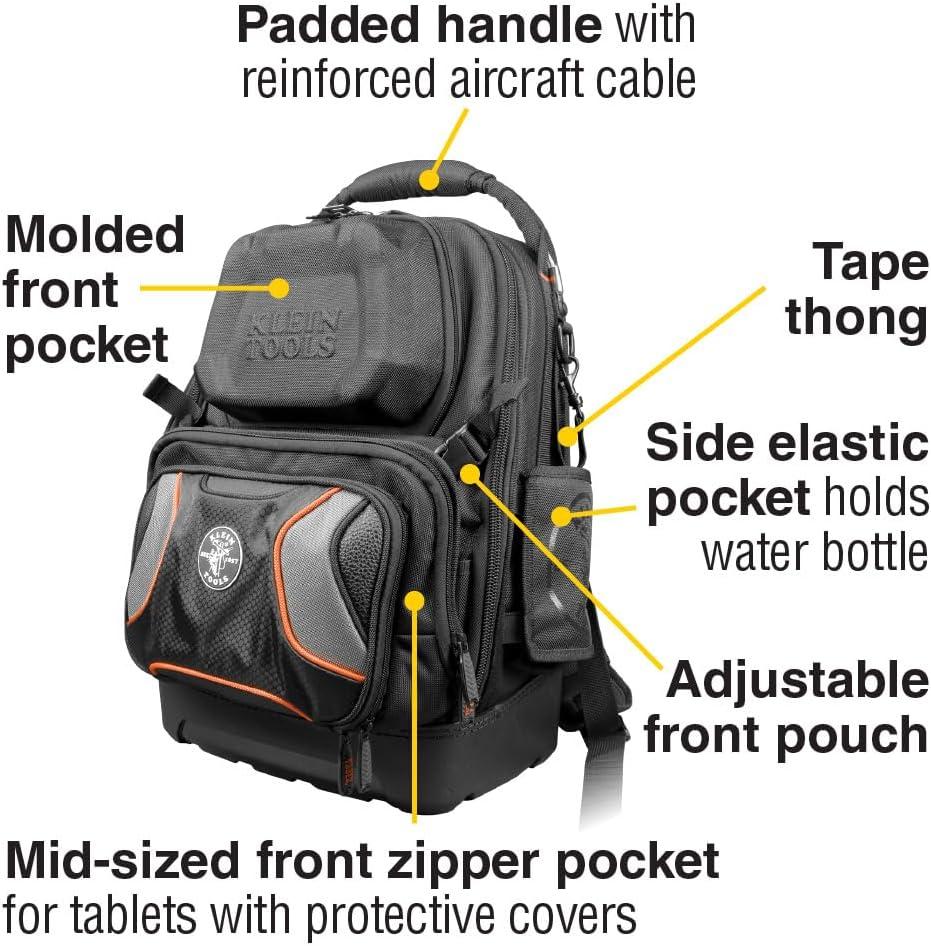 The new Klein Tools' Tradesman Pro Tool Master Backpack is a seriously tough backpack starting with a handle reinforced with aircraft cable, 1680d ballistic weave material construction, and a fully-molded waterproof bottom. With 48 pockets inside and out, this backpack has plenty of room for all sorts of hand tools, tablets, cables and wires, safety equipment, attachments, accessories, and more. In fact, the adjustable front pouch is a perfect spot for your drill. Need only a few tools for your next task? The removable tool caddy is designed for you to take just what you need. Both the tool caddy and the backpack can be hung, keeping your tools easily within reach.