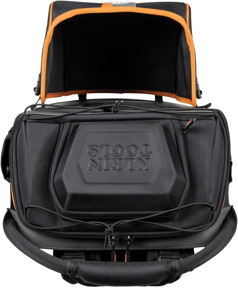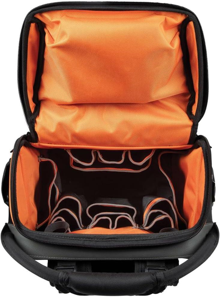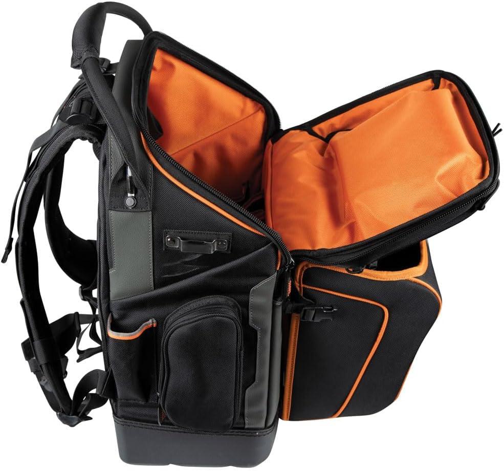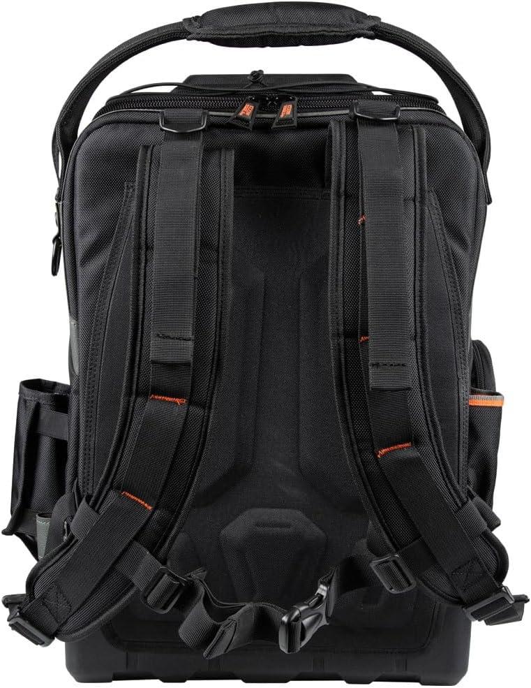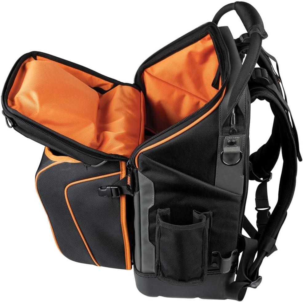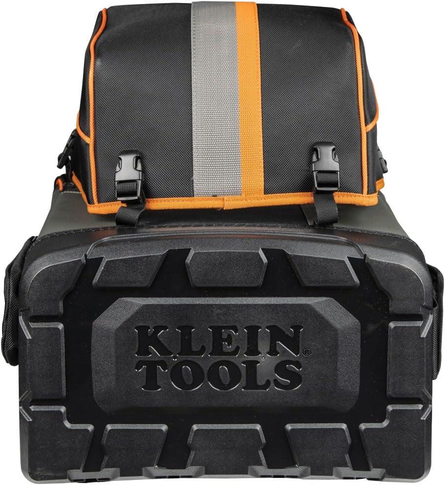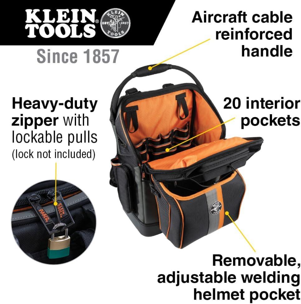 The Klein Tools Tradesman Pro Ironworker and Welder Backpack's exterior is made of flame resistant 1680d ballistic weave and leatherette materials for durability. This 27 pocket tool bag fits a 24-Inch to 36-Inch connecting bar, welding helmet and hard hat, has storage for additional tools, gear, and safety equipment, and has a weight capacity of 50-Pound (22.7 kg). This tough backpack with fully molded bottom, aircraft cable reinforced handle, and hard front pocket was designed with the professional ironworker and welder in mind.