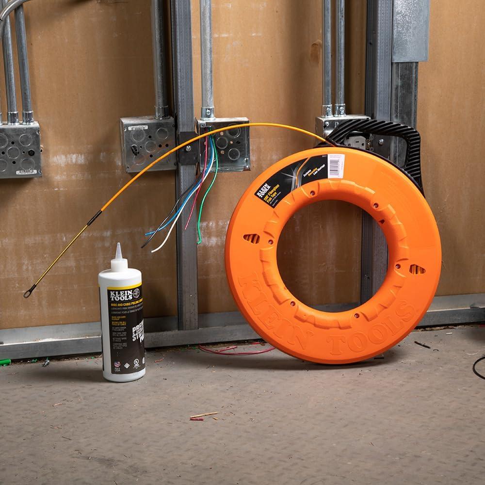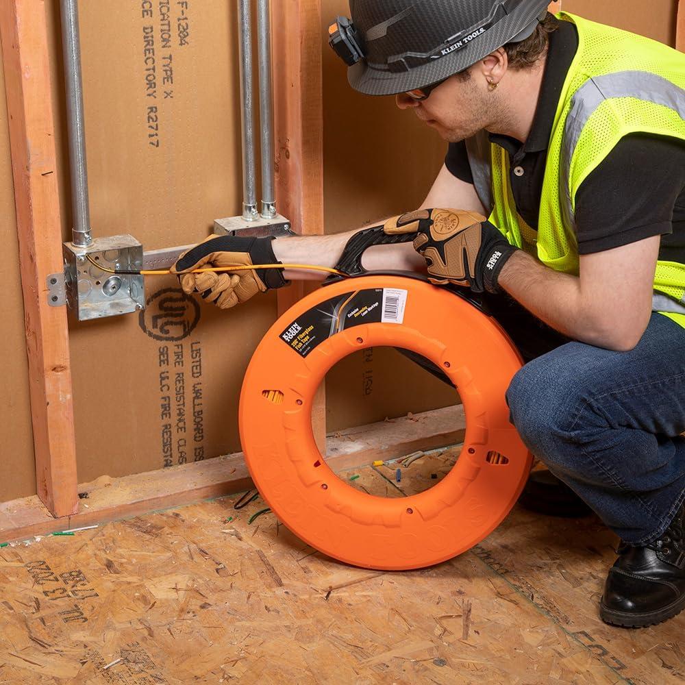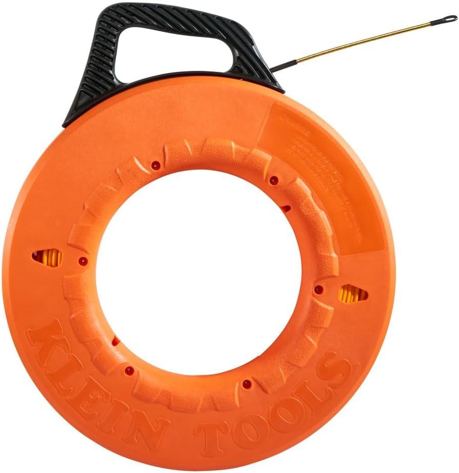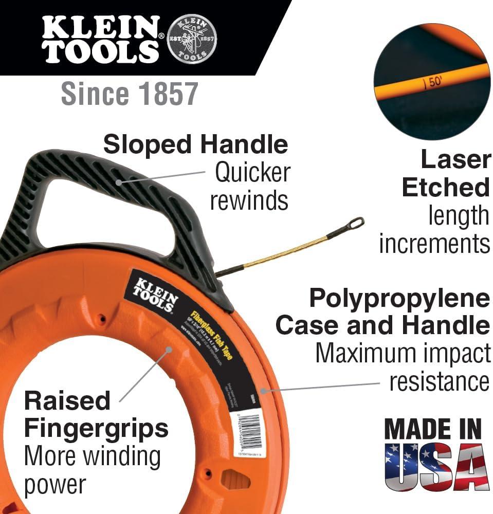 Designed for even longer conduit runs, the Klein Tools 200-foot (60.96 m) Fiberglass Fish Tape is flexible enough to glide over existing wires in crowded conduit, but stiffer than other non-conductive fish tapes. The 17-Inch (432 mm) case diameter allows user to reel in 10-percent more tape in a single revolution than 16-Inch (406 mm) diameter fish tape cases, saving time and effort. For more than 160 years, Klein Tools has manufactured premium-quality, professional-grade hand tools that deliver the performance, durability and precision needed to get the job done right. Our family of engineers, workers and craftsman continue to put six generations of expertise into every tool we create by using only the highest quality materials, superior workmanship, and keeping manufacturing as close to home as we can. Klein isn't just the name of our company, it's also our family name. And since we're an American company that's family-owned and family-run, you know you can count on us to be here tomorrow. Klein Tools doesn't just make great products, we make great products that stand up to the demands of the professionals who use them every day … Since 1857.