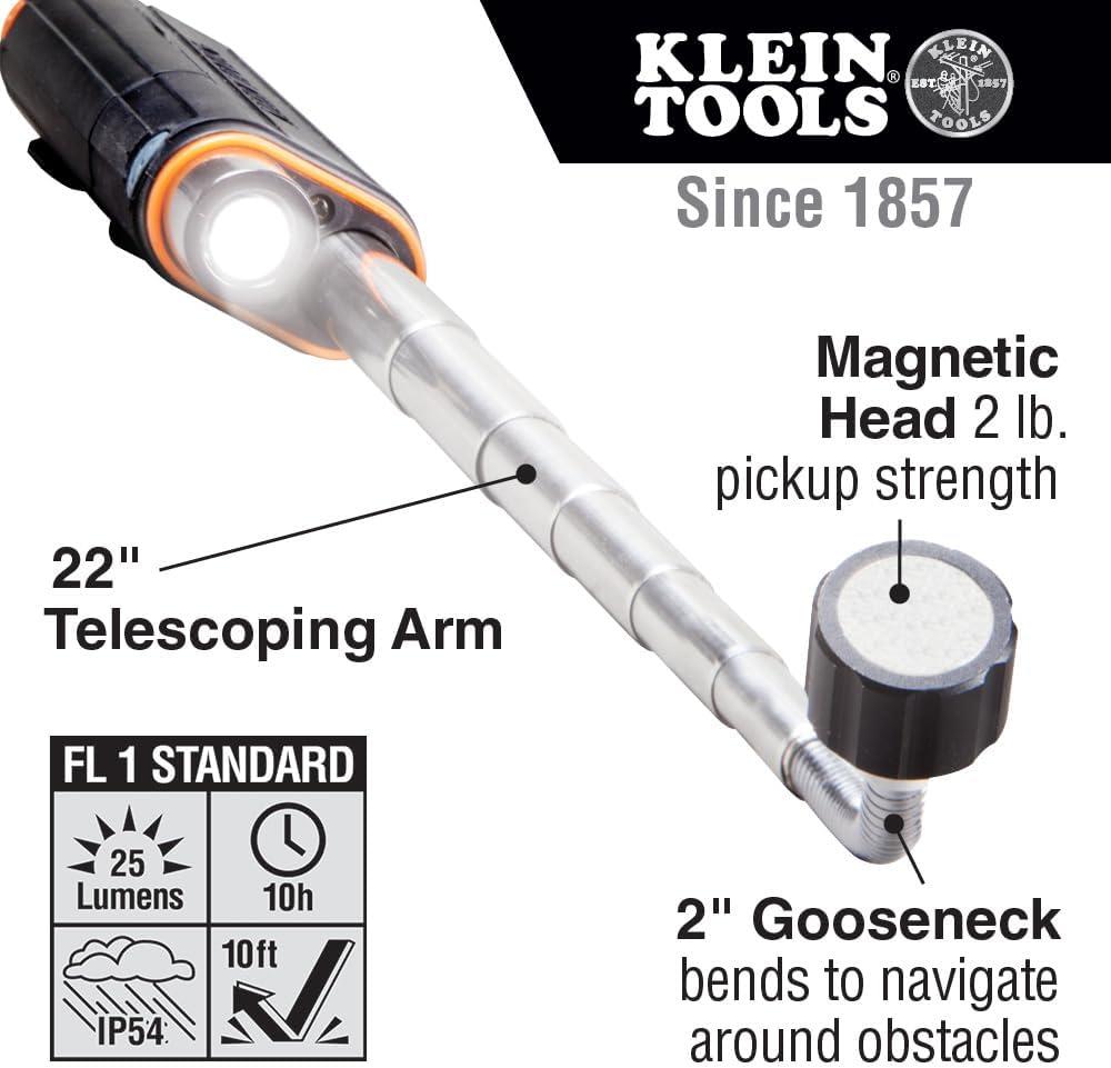 EXTENDED REACH: The Klein Telescoping LED Light and Pickup Tool features a telescoping arm that extends 22 inches, allowing for retrieval of tools or parts that are out of reach