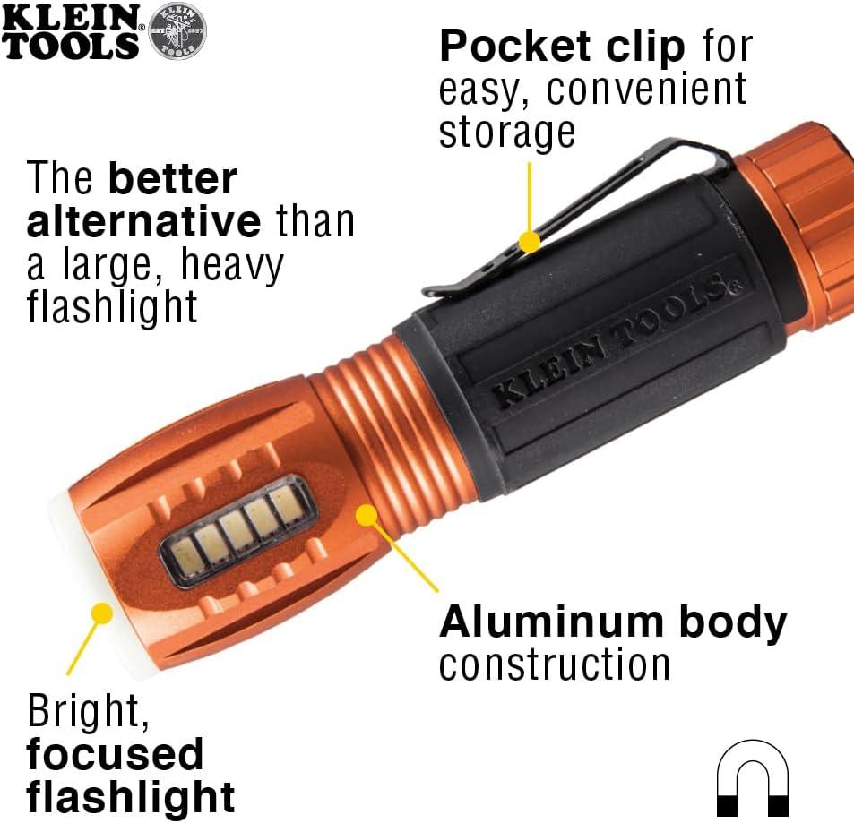 The Klein Tools LED Flashlight with Work Light is a better alternative than a large, heavy flashlight when working in low light areas. This light is both a bright, focused flashlight and a broadcasting flood light in one small package. Just secure the light on a metal surface with the strong magnet for convenient hands-free function. For more than 160 years, Klein Tools has manufactured premium-quality, professional-grade hand tools that deliver the performance, durability and precision needed to get the job done right. Our family of engineers, workers and craftsman continue to put six generations of expertise into every tool we create by using only the highest quality materials, superior workmanship, and keeping manufacturing as close to home as we can. Klein isn't just the name of our company, it's also our family name. And since we're an American company that's family-owned and family-run, you know you can count on us to be here tomorrow. Klein Tools doesn't just make great products, we make great products that stand up to the demands of the professionals who use them every day … Since 1857.