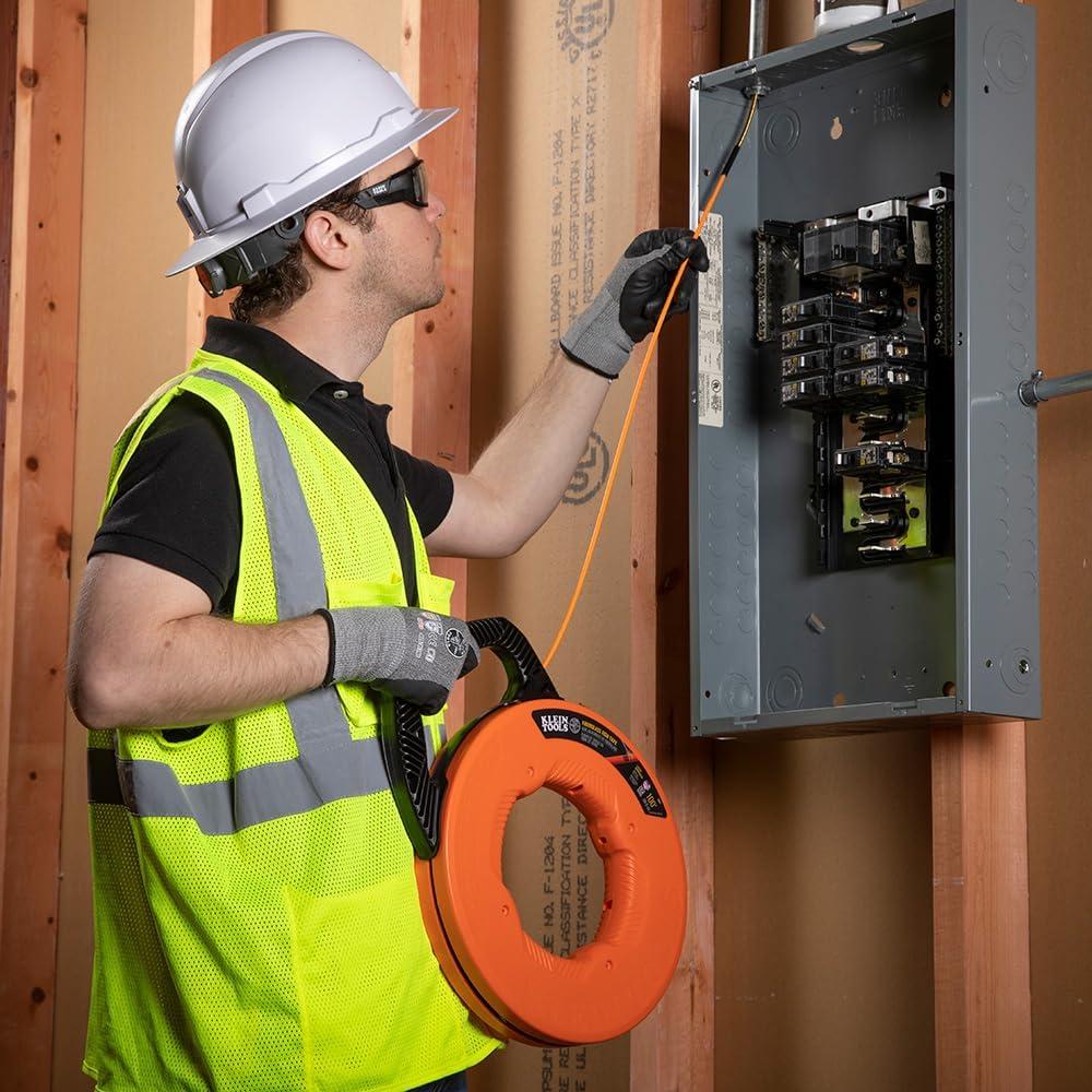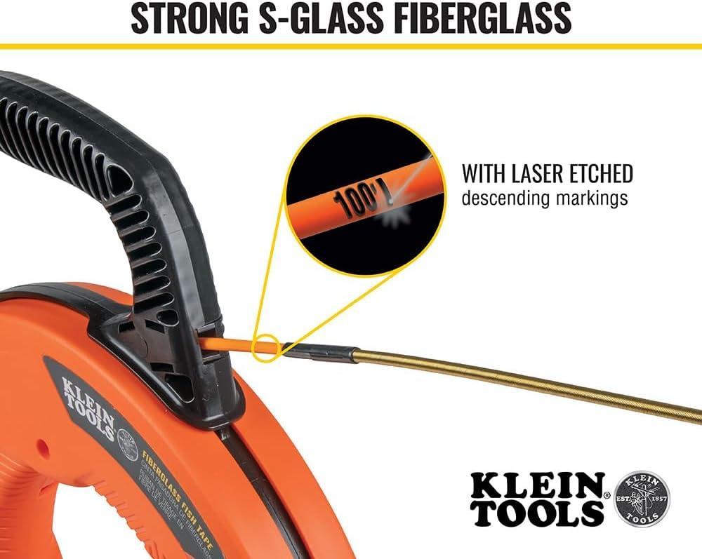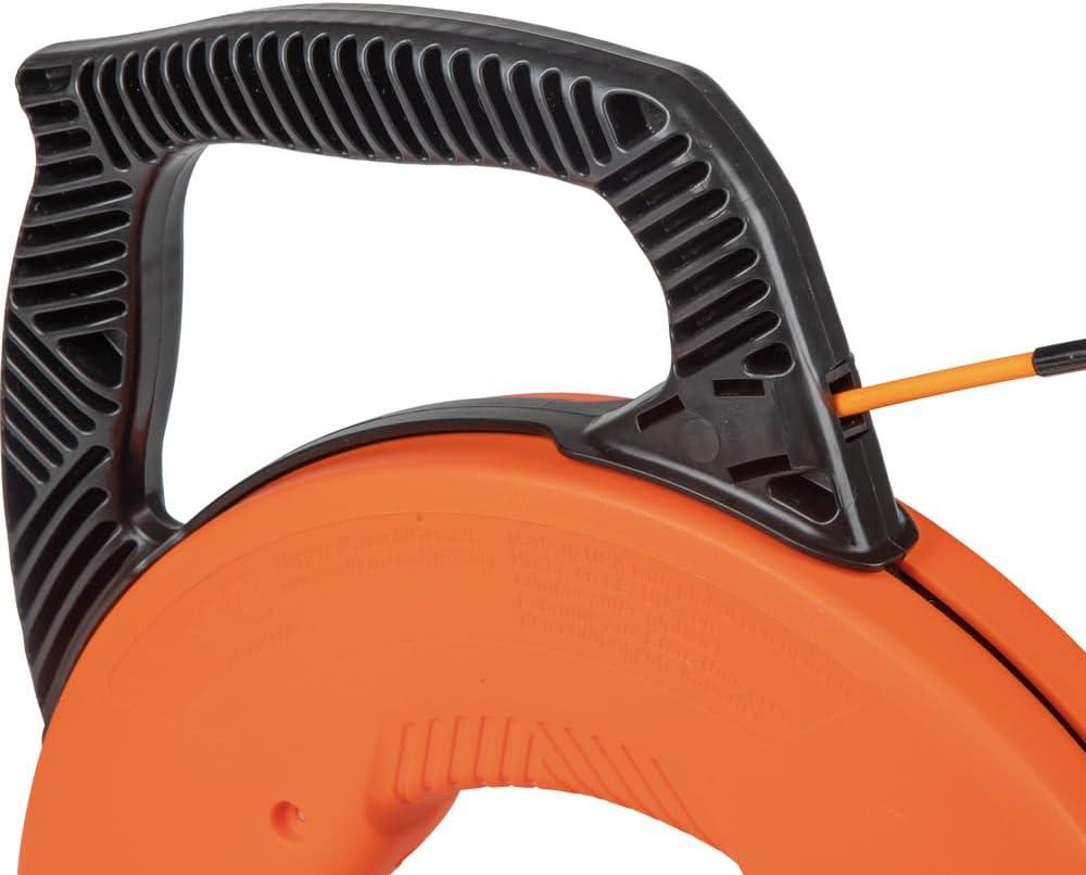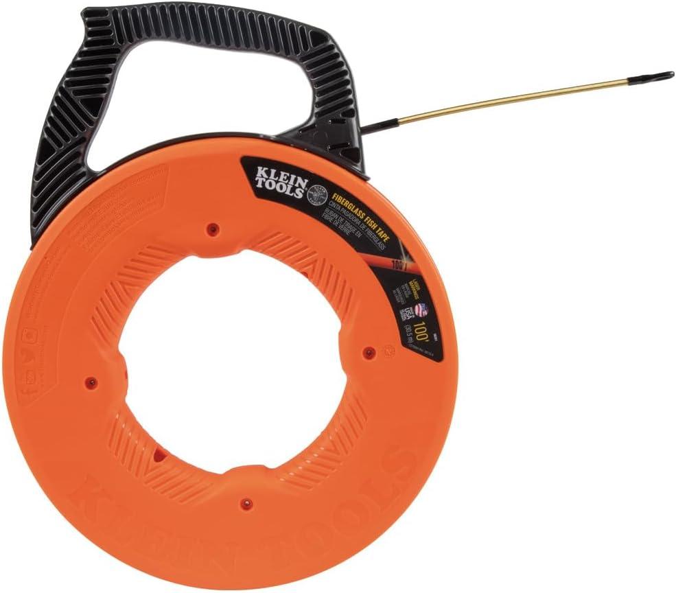 The Klein Tools' 100-Foot Fiberglass Fish Tape with Spiral Steel Leader is perfect for wire runs associated with commercial, residential and voice-data-video installations. The optimized housing and handle design decreases payout effort and reduces binding. A multiple-position handle allows for a firm, steady grip as you pull or rewind the tape. The unique interior case shape combines the leverage of square cases and the comfort of round cases, which makes rewinding tape after a long run easier. The tape features laser-etched descending markings placed at every foot. These markings allow you to accurately measure the depth of conduit runs and determine the amount of tape left to pay out.