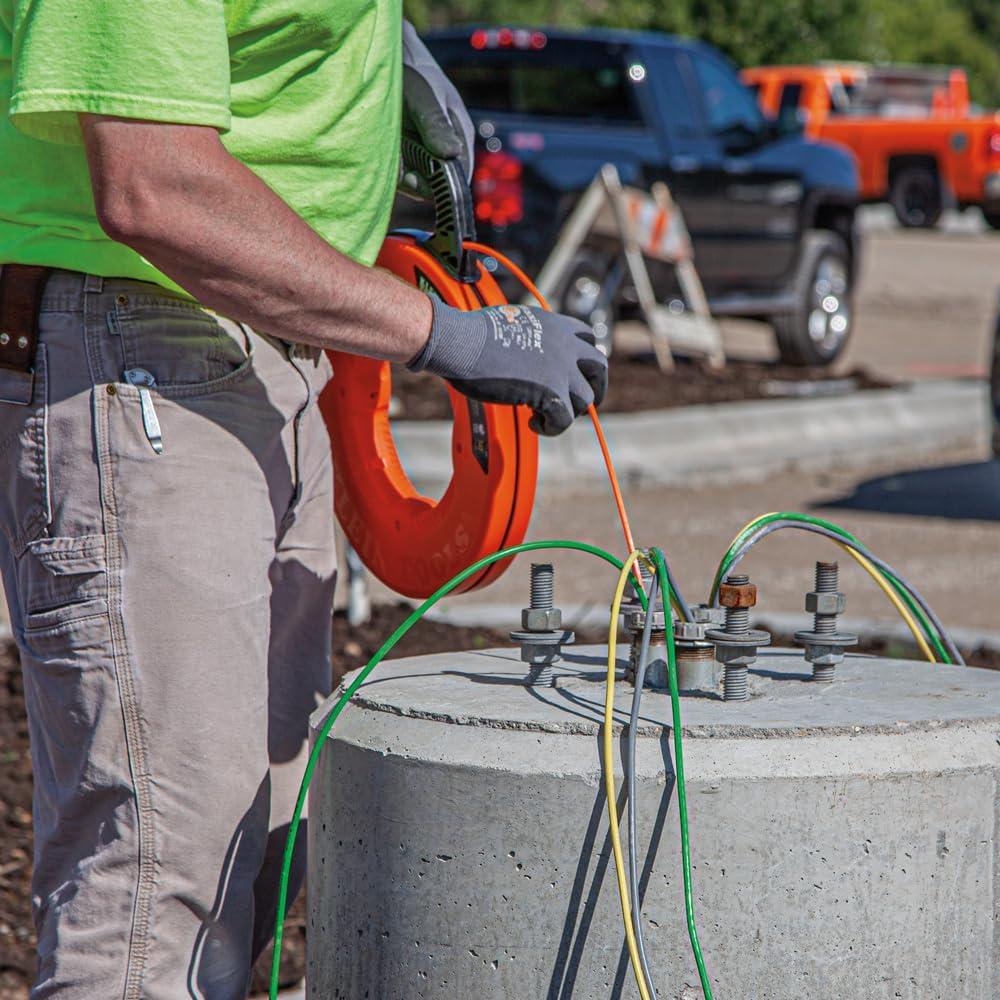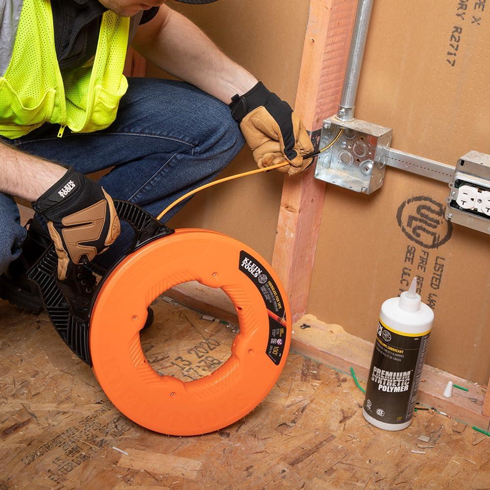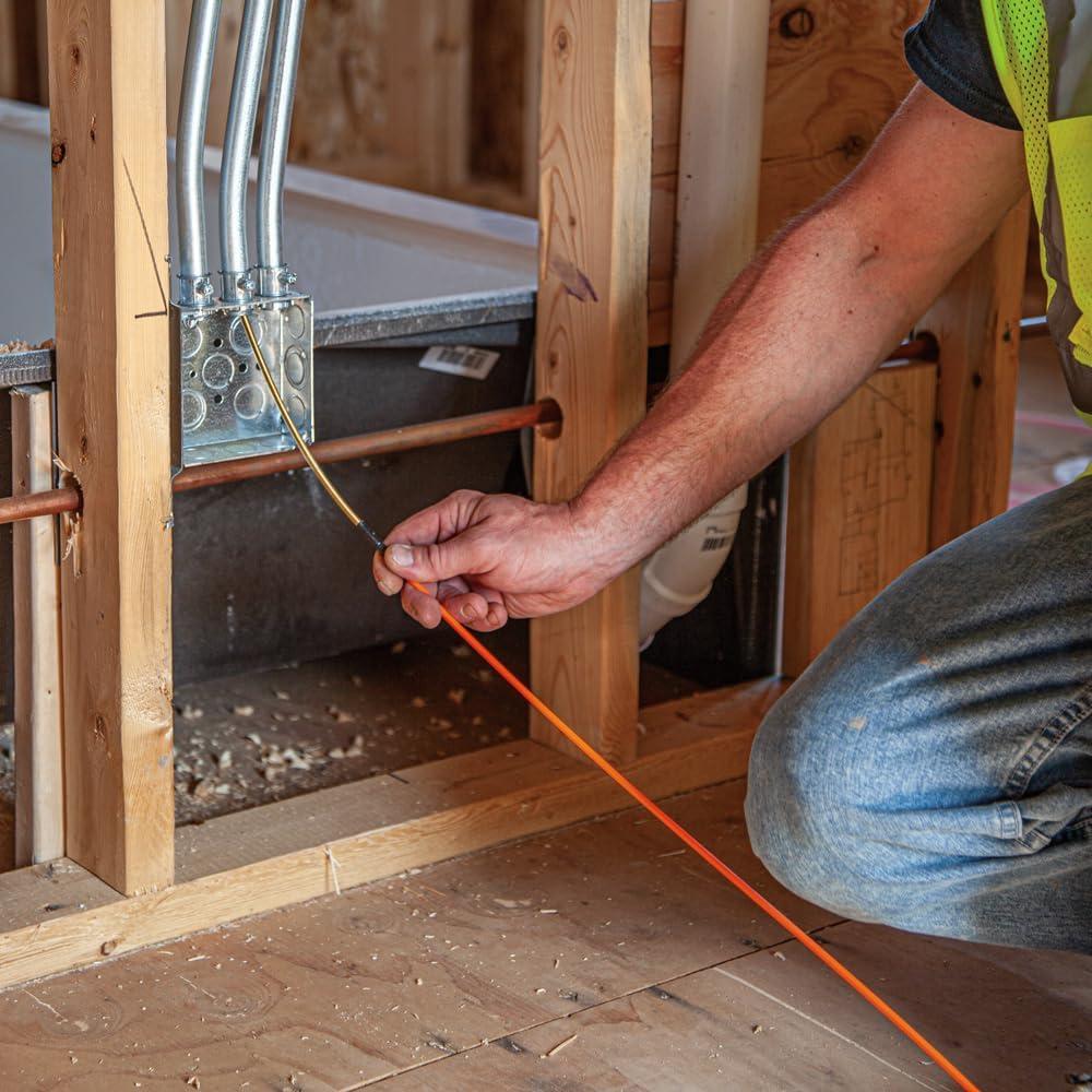 The Klein Tools' 100-Foot Fiberglass Fish Tape with Spiral Steel Leader is perfect for wire runs associated with commercial, residential and voice-data-video installations. The optimized housing and handle design decreases payout effort and reduces binding. A multiple-position handle allows for a firm, steady grip as you pull or rewind the tape. The unique interior case shape combines the leverage of square cases and the comfort of round cases, which makes rewinding tape after a long run easier. The tape features laser-etched descending markings placed at every foot. These markings allow you to accurately measure the depth of conduit runs and determine the amount of tape left to pay out.
