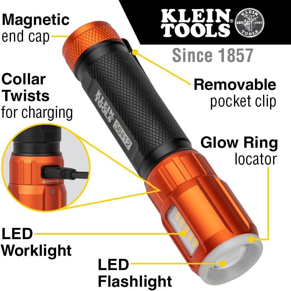 Klein Tools' rechargeable flashlight also works as a handy work light with its magnetic end cap and side-barrel LEDs. This versatile light offers 5 total modes. Smartly designed to turn back on in the same mode you last turned it off, so fewer clicks to get to your favorite mode. This durable flashlight is IP66 dustproof and water-resistant, making it a perfect everyday light on the job site. For more than 160 years, Klein Tools has manufactured premium-quality, professional-grade hand tools that deliver the performance, durability and precision needed to get the job done right. Our family of engineers, workers and craftsman continue to put six generations of expertise into every tool we create by using only the highest quality materials, superior workmanship, and keeping manufacturing as close to home as we can. Klein isn't just the name of our company, it's also our family name. And since we're an American company that's family-owned and family-run, you know you can count on us to be here tomorrow. Klein Tools doesn't just make great products, we make great products that stand up to the demands of the professionals who use them every day … Since 1857.
