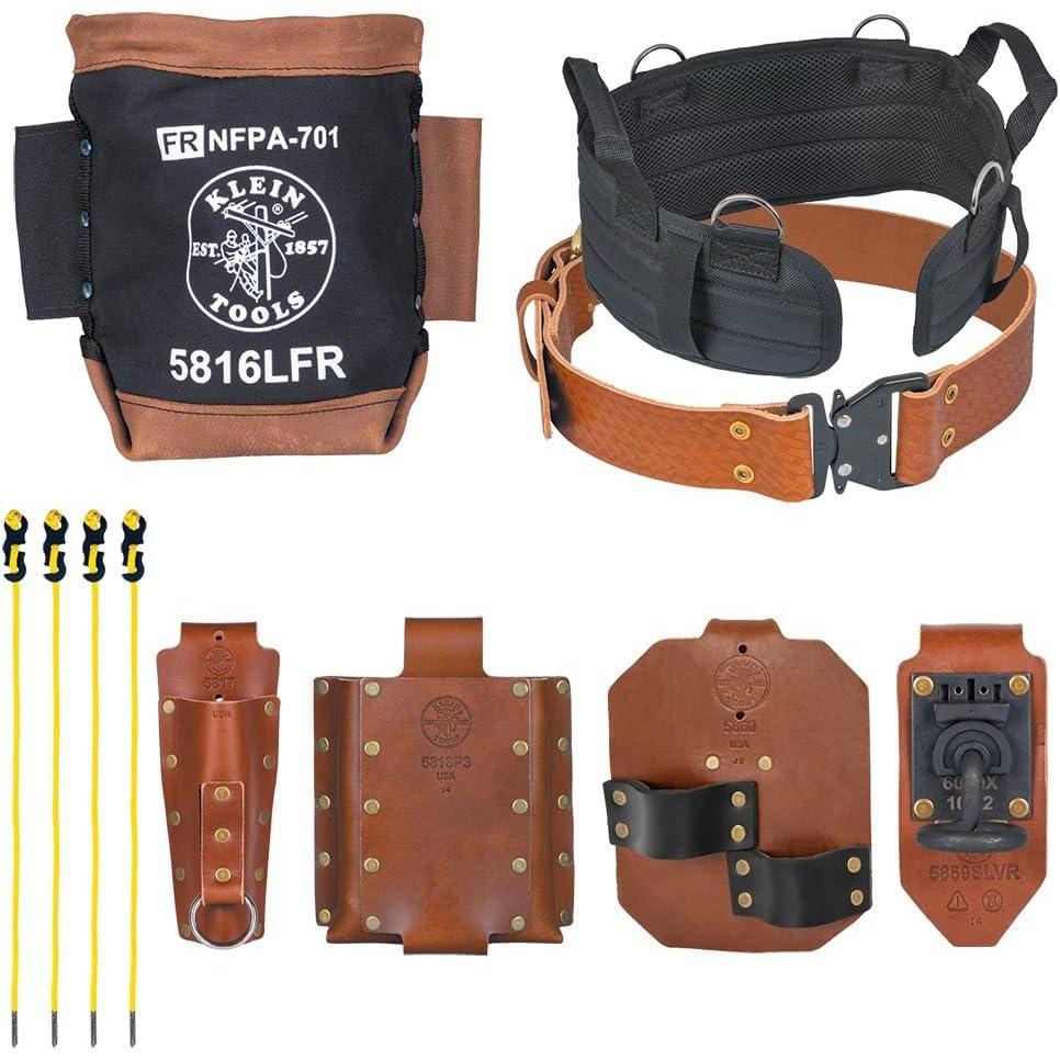 Complete Ironworker Tool Belt Set combines comfort, organization, and durability. The quick-release leather belt buckle (Cat. No. 5826L) lets you immediately disengage the belt if needed. The set also includes a hybrid bolt bag (Cat. No. 5816LFR), heavy duty spud wrench holder (Cat. No. 5890), adjustable connecting bar holder (Cat. No. 5859SLVR), multi-functional bull pin holder (Cat. No. 5817), tension straps (Cat. No. 5890), 3-Pocket tool holder (Cat. No. 5818P3), and a pro-pad. For more than 160 years, Klein Tools has manufactured premium-quality, professional-grade hand tools that deliver the performance, durability and precision needed to get the job done right. Our family of engineers, workers and craftsman continue to put six generations of expertise into every tool we create by using only the highest quality materials, superior workmanship, and keeping manufacturing as close to home as we can. Klein isn't just the name of our company, it's also our family name. And since we're an American company that's family-owned and family-run, you know you can count on us to be here tomorrow. Klein Tools doesn't just make great products, we make great products that stand up to the demands of the professionals who use them every day … Since 1857.