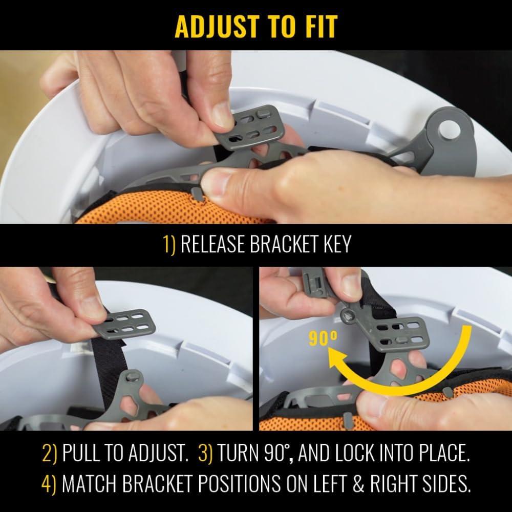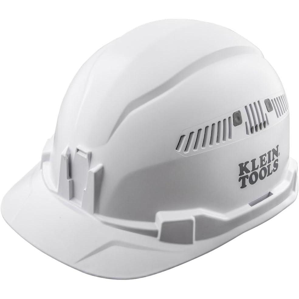 Safety hard hat has patent-pending accessory mounts on front and back ensure optional Klein Headlamps attach securely and precisely, every time — no straps or zip ties needed!