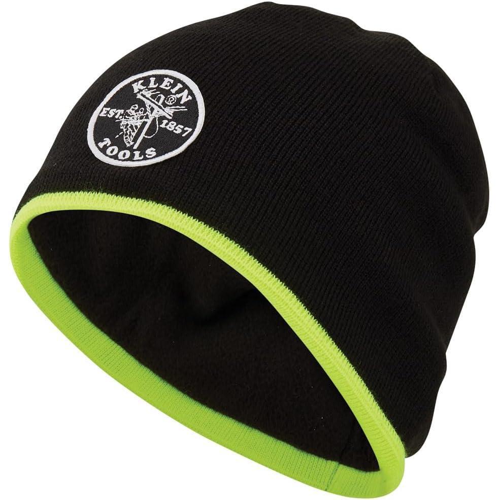 Klein Tools 60391 Knit Beanie, Thermal Fleece Winter Hat, Windproof, Fits under Helmets, Black with High-Visibility Yellow Band Trim(Winter Hat)