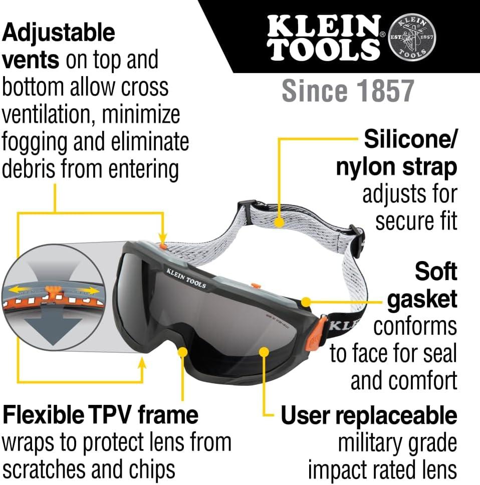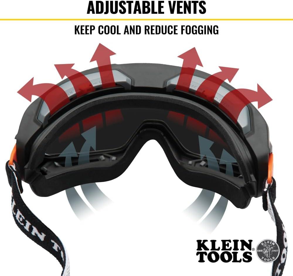 Klein Tools Professional Safety Goggles are high-quality protective eyewear that feature OTG design (over the glasses) and anti-fog coating that won't wear off. Scratch resistant clear lenses with UV protection block 99.9 percent of harmful UV rays. Lightweight flexible materials offer non-slip fit, with strap for long-term comfort. Adjustable vents open to enhance air flow or close to protect eyes from debris. Includes soft storage pouch. (Clear or Gray Replacement Lenses sold separately). For more than 160 years, Klein Tools has manufactured premium-quality, professional-grade hand tools that deliver the performance, durability and precision needed to get the job done right. Our family of engineers, workers and craftsman continue to put six generations of expertise into every tool we create by using only the highest quality materials, superior workmanship, and keeping manufacturing as close to home as we can. Klein isn't just the name of our company, it's also our family name. And since we're an American company that's family-owned and family-run, you know you can count on us to be here tomorrow. Klein Tools doesn't just make great products, we make great products that stand up to the demands of the professionals who use them every day … Since 1857.