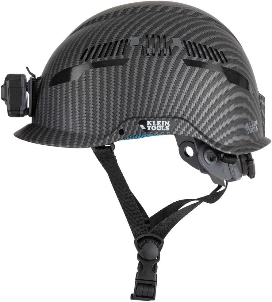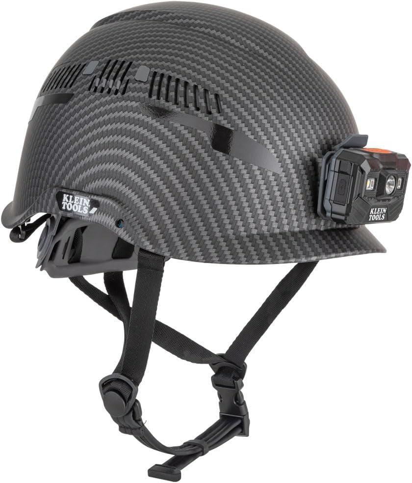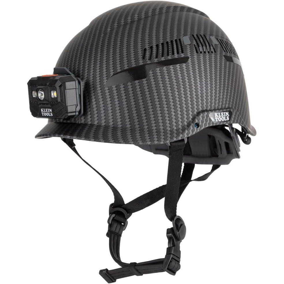 Klein Tools 60515 Safety Helmet, Non-Vented Class E with Rechargeable Lamp and Chin Strap, Premium KARBN Pattern, Tested up to 20kV(Helmet)