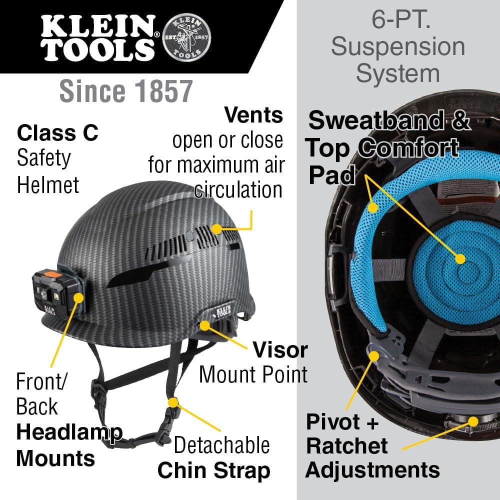 imageKlein Tools 60517 Safety Helmet Vented Class C with Rechargeable Lamp and Chin Strap Premium KARBN Pattern Adjustable Vents