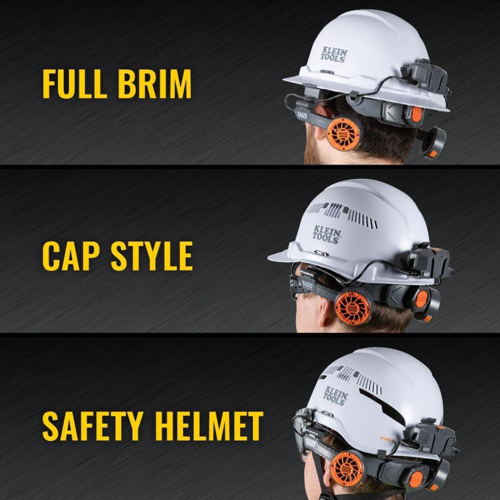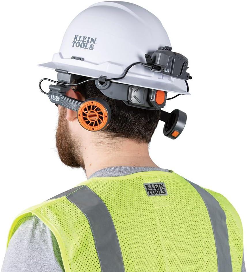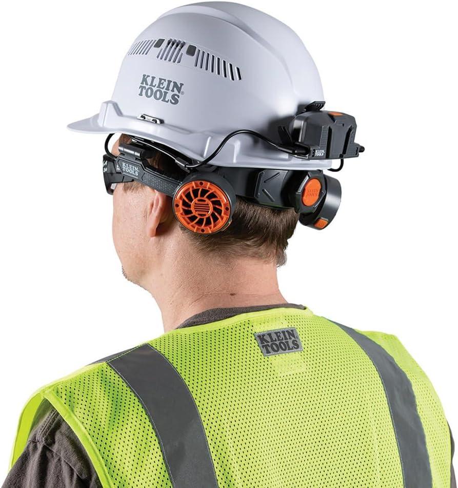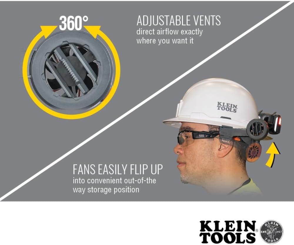 The Klein Tools' Lightweight Cooling Fan is designed to fit Klein Tools Hard Hats (cap style and full brim) and Klein Safety Helmets to primarily direct airflow to the neck area and back of the head. The quiet fan can be independently controlled, adjusted and positioned for all day comfort. The compact fan attaches to the side accessory slots to maintain good balance, low profile, and help focus airflow. They can be conveniently flipped up for storage when not in use. Powered by Klein's Modular Rechargeable Battery (Cat. No. 29025) that can be used to charge other small USB devices or swapped out with a spare for extended run time.
