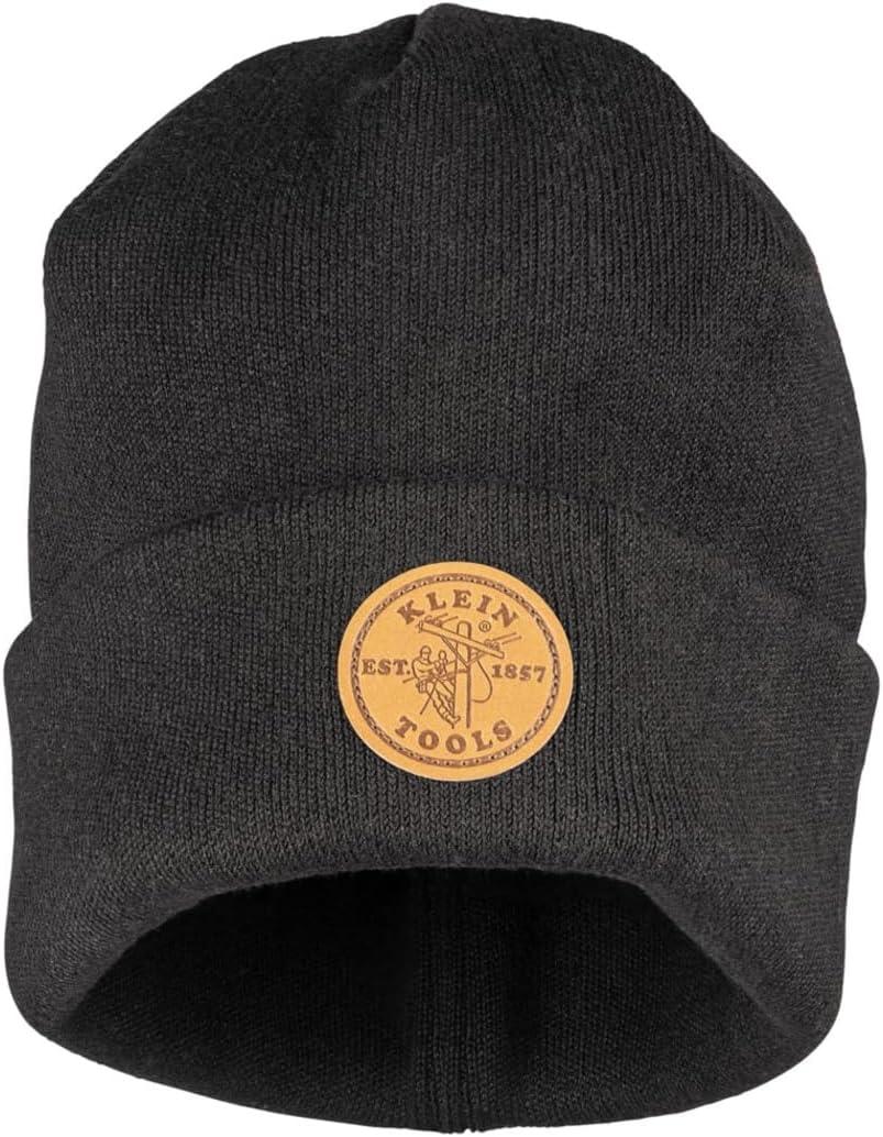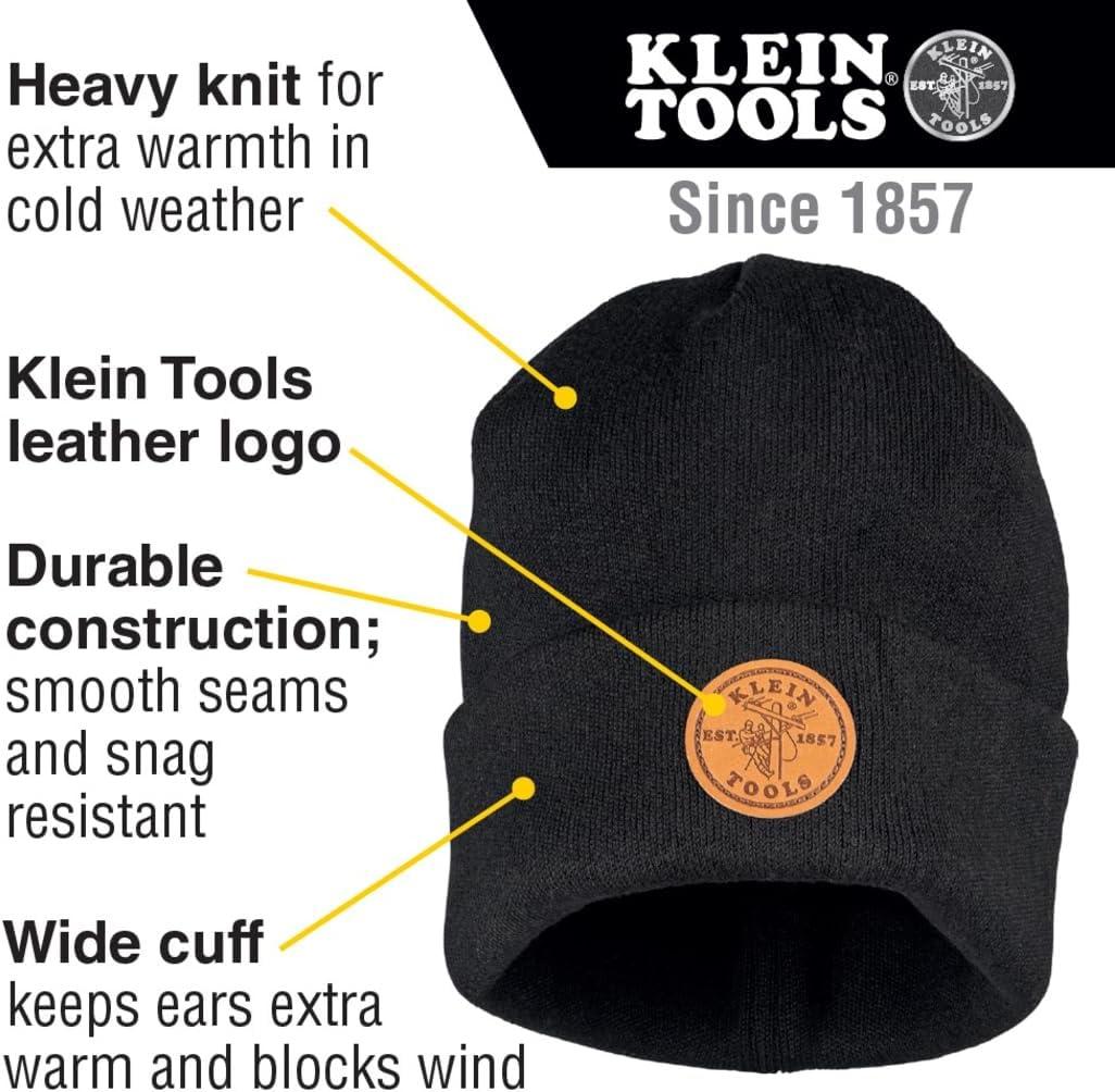 The Black Heavy Knit hat from Klein Tools provides extra warmth and a snug fit. Featuring the Klein Tools leather logo displayed prominently on the front, the wide cuff keeps ears extra warm and blocks wind. Durable with smooth seams. Winter Gear from Klein Tools provides ultimate warmth options so you can focus on getting the job done. For more than 160 years, Klein Tools has manufactured premium-quality, professional-grade hand tools that deliver the performance, durability and precision needed to get the job done right. Our family of engineers, workers and craftsman continue to put six generations of expertise into every tool we create by using only the highest quality materials, superior workmanship, and keeping manufacturing as close to home as we can. Klein isn't just the name of our company, it's also our family name. And since we're an American company that's family-owned and family-run, you know you can count on us to be here tomorrow. Klein Tools doesn't just make great products, we make great products that stand up to the demands of the professionals who use them every day … Since 1857.
