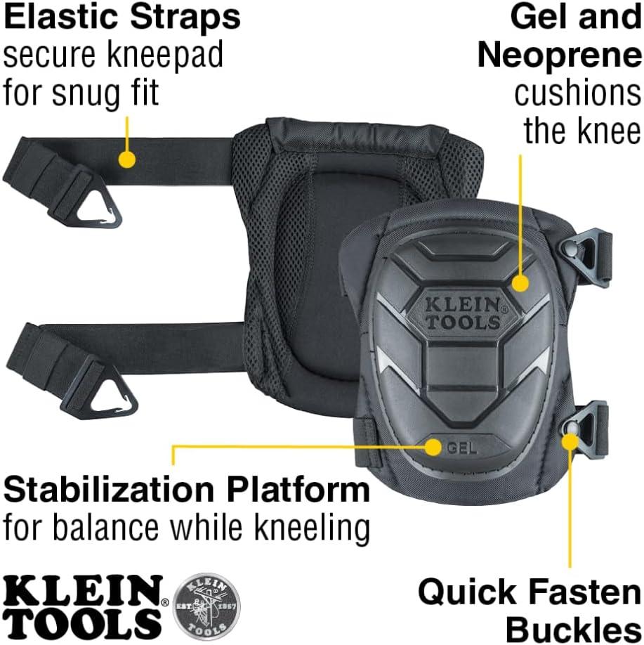 Klein Tools 60895 Knee Pads for Men and Women, Heavy Duty Semi-Round Stabilizer Gel Knee Pads with Adjustable Elastic Straps, for Construction, Flooring, Gardening, Black