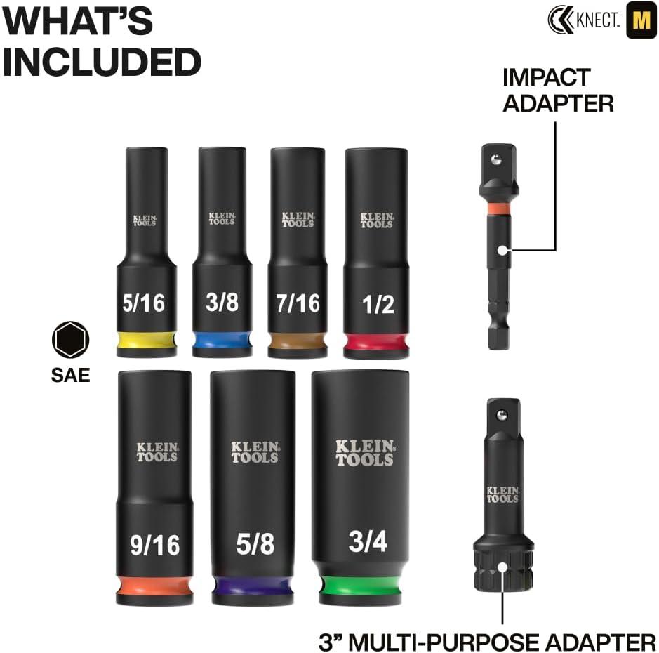 This 9-piece SAE deep-well impact socket set is built for tough jobs, featuring the most common sizes up to 3/4-Inch. Sockets offer superior access for hard-to-reach areas, while stamped size markings with white in-fill and color-coded rings ensure quick identification. Made from heat-treated Cr-Mo steel, these sockets withstand extreme torque. Includes two adapters and a MODbox accessory case for compact, modular storage. For more than 160 years, Klein Tools has manufactured premium-quality, professional-grade hand tools that deliver the performance, durability and precision needed to get the job done right. Our family of engineers, workers and craftsman continue to put six generations of expertise into every tool we create by using only the highest quality materials, superior workmanship, and keeping manufacturing as close to home as we can. Klein isn't just the name of our company, it's also our family name. And since we're an American company that's family-owned and family-run, you know you can count on us to be here tomorrow. Klein Tools doesn't just make great products, we make great products that stand up to the demands of the professionals who use them every day … Since 1857.