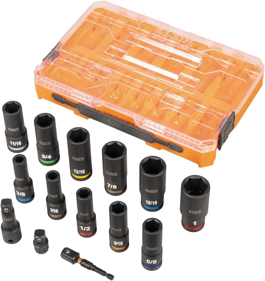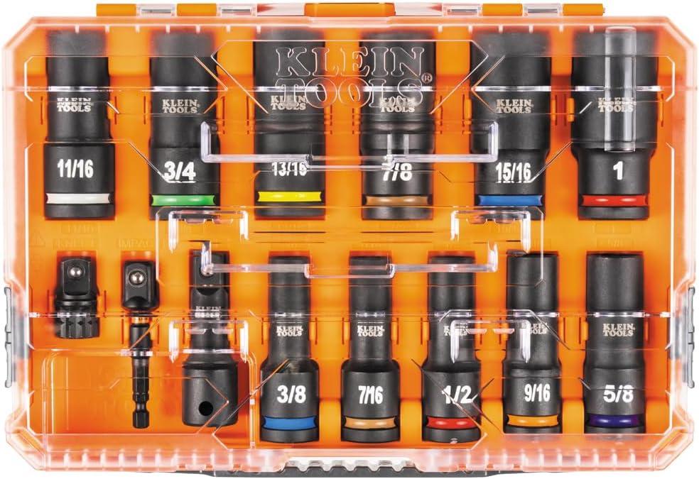 This 14-Piece impact socket set features color-coded sockets in sizes 3/8, 7/16, 1/2, 9/16, 5/8, 11/16, 3/4, 13/16, 7/8, 15/16 and 1-Inch. Each impact socket provides increased reach and additional depth for longer bolts. Also comes in a compact, modular storage system that is compatible with MODbox and stackable with other cases of similar design. For more than 160 years, Klein Tools has manufactured premium-quality, professional-grade hand tools that deliver the performance, durability and precision needed to get the job done right. Our family of engineers, workers and craftsman continue to put six generations of expertise into every tool we create by using only the highest quality materials, superior workmanship, and keeping manufacturing as close to home as we can. Klein isn't just the name of our company, it's also our family name. And since we're an American company that's family-owned and family-run, you know you can count on us to be here tomorrow. Klein Tools doesn't just make great products, we make great products that stand up to the demands of the professionals who use them every day … Since 1857.