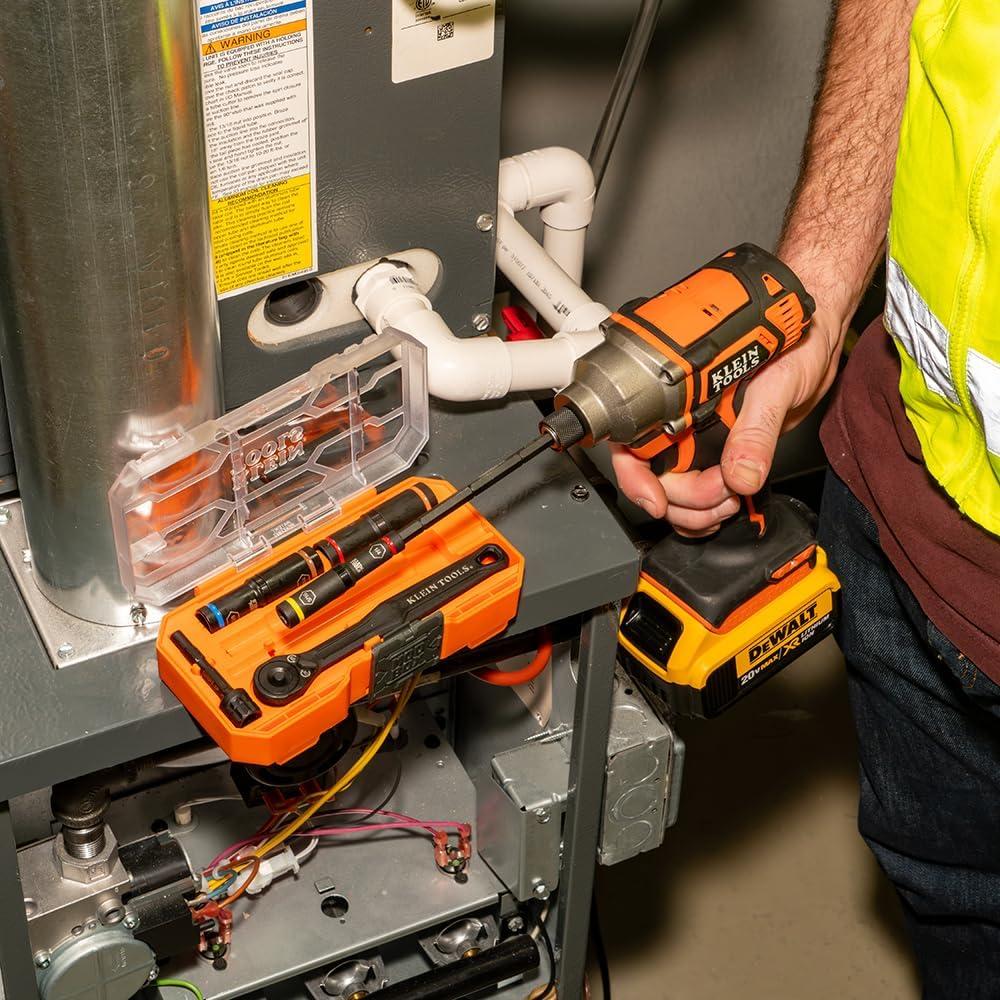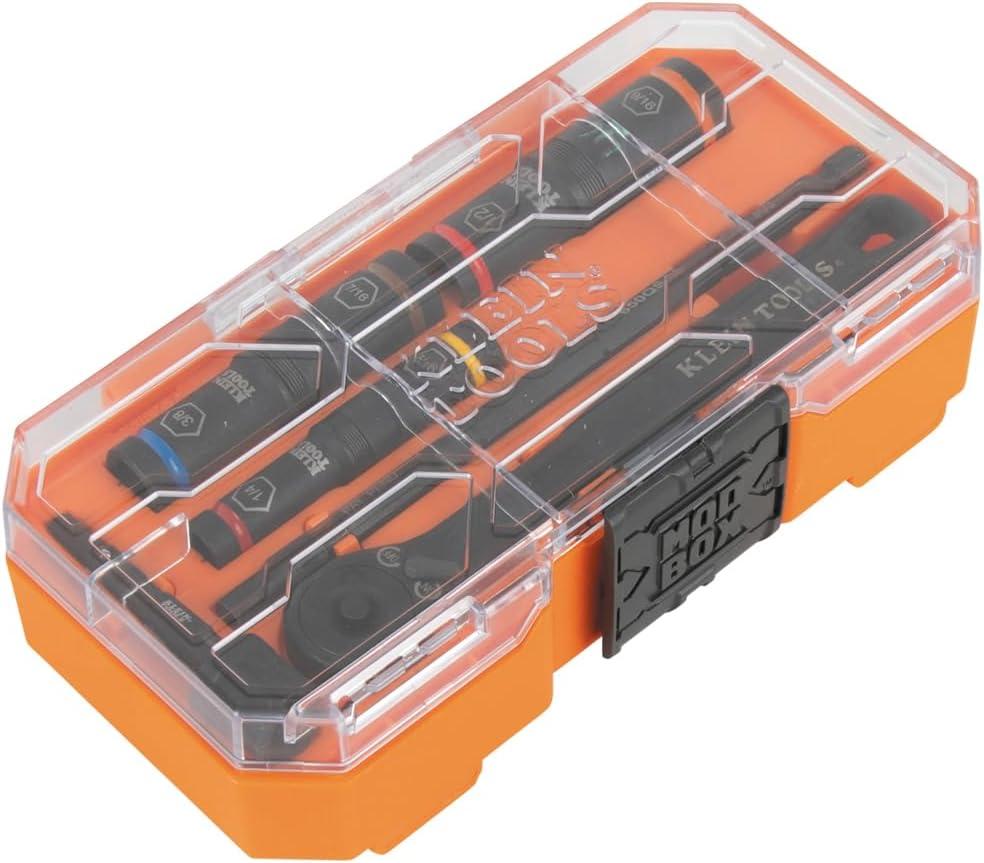 This 7-Piece Impact Socket Set features 6 standard sizes in three color-coded sockets. Each impact flip socket features two coaxial spring-loaded sockets in one. Set includes Nested adapters for dual drive (1/4-Inch hex flip socket shaft nests into 3/8-Inch square drive adapter). Also comes with a compact, modular storage system with a clear lid that is compatible with MODbox and stackable with other cases of its similar design. For more than 160 years, Klein Tools has manufactured premium-quality, professional-grade hand tools that deliver the performance, durability and precision needed to get the job done right. Our family of engineers, workers and craftsman continue to put six generations of expertise into every tool we create by using only the highest quality materials, superior workmanship, and keeping manufacturing as close to home as we can. Klein isn't just the name of our company, it's also our family name. And since we're an American company that's family-owned and family-run, you know you can count on us to be here tomorrow. Klein Tools doesn't just make great products, we make great products that stand up to the demands of the professionals who use them every day … Since 1857.