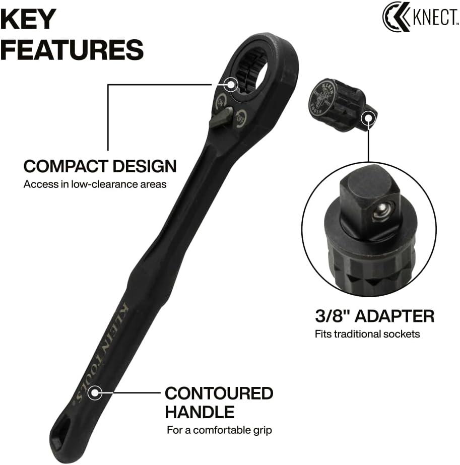imageKLEIN TOOLS 65408ADP KNECT M Pass Through Ratchet and 38Inch Socket Adapter Set 90Tooth Wrench for Extended Threaded Rods Compact and Comfortable Grip Traditional Socket CompatibilityM 38Inch