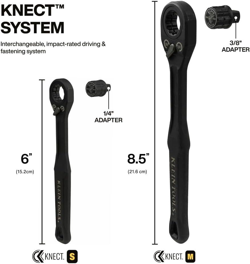 KLEIN TOOLS 65408ADP KNECT (M) Pass Through Ratchet and 3/8-Inch Socket Adapter Set, 90-Tooth Wrench for Extended Threaded Rods, Compact and Comfortable Grip, Traditional Socket Compatibility((S) 1/4-Inch)
