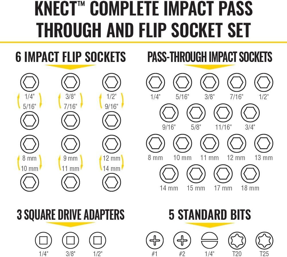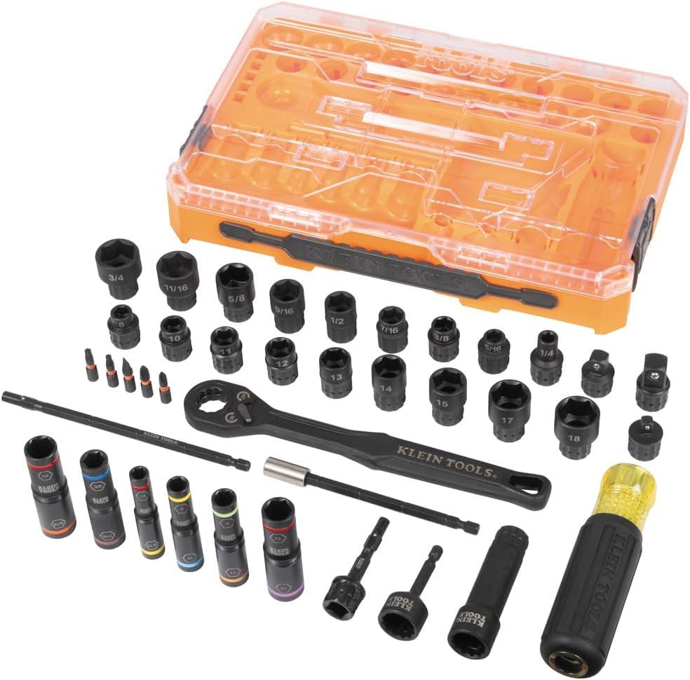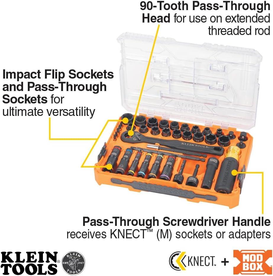 The Klein Tools 39-Piece Complete KNECT Pass Through Impact Socket Set features a 90-tooth pass through ratchet and a Cushion-Grip pass through screwdriver for driving hex nuts on extended threaded rod. The 1/4-Inch square drive adapter allows for use with traditional sockets. Set includes 18 SAE and metric impact-rated sockets, 6 SAE and metric HD flip sockets, and (5) 1/4-Inch ProFlex impact driver bits. For more than 160 years, Klein Tools has manufactured premium-quality, professional-grade hand tools that deliver the performance, durability and precision needed to get the job done right. Our family of engineers, workers and craftsman continue to put six generations of expertise into every tool we create by using only the highest quality materials, superior workmanship, and keeping manufacturing as close to home as we can. Klein isn't just the name of our company, it's also our family name. And since we're an American company that's family-owned and family-run, you know you can count on us to be here tomorrow. Klein Tools doesn't just make great products, we make great products that stand up to the demands of the professionals who use them every day … Since 1857.