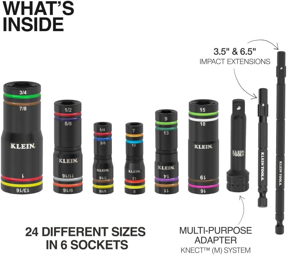 The Quad-24 deep well impact flip socket set combines 24 SAE and Metric hex sizes in 6 color coded sockets. Small 1/4 to 7/16-Inch (7 to 12 mm), medium 1/2 to 11/16-Inch (9 to 14 mm), and large 3/4 to 1-Inch (15 to 19 mm). The spring-loaded action allows for hands-free size changes by applying pressure to the smaller socket to compress it out of the way. Compatible with Klein Tools' 1/4-Inch hex flip socket impact shaft, these Quad Sockets are a compact and convenient solution for any job.