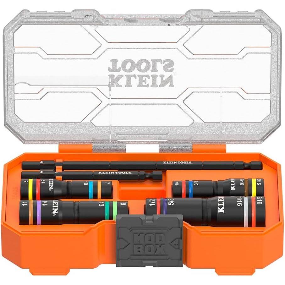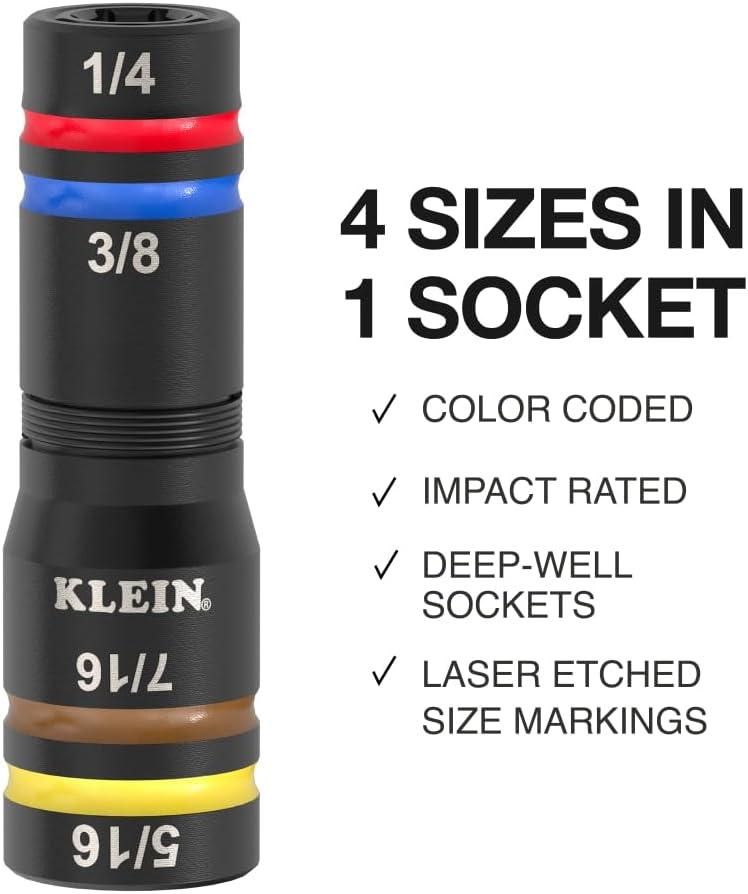 The Quad-24 deep well impact flip socket set combines 24 SAE and Metric hex sizes in 6 color coded sockets. Small 1/4 to 7/16-Inch (7 to 12 mm), medium 1/2 to 11/16-Inch (9 to 14 mm), and large 3/4 to 1-Inch (15 to 19 mm). The spring-loaded action allows for hands-free size changes by applying pressure to the smaller socket to compress it out of the way. Compatible with Klein Tools' 1/4-Inch hex flip socket impact shaft, these Quad Sockets are a compact and convenient solution for any job.