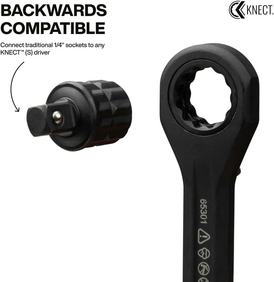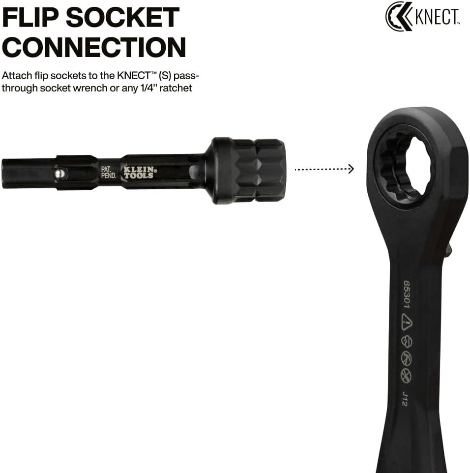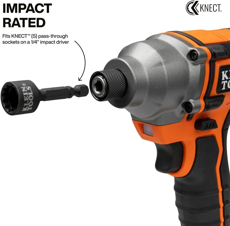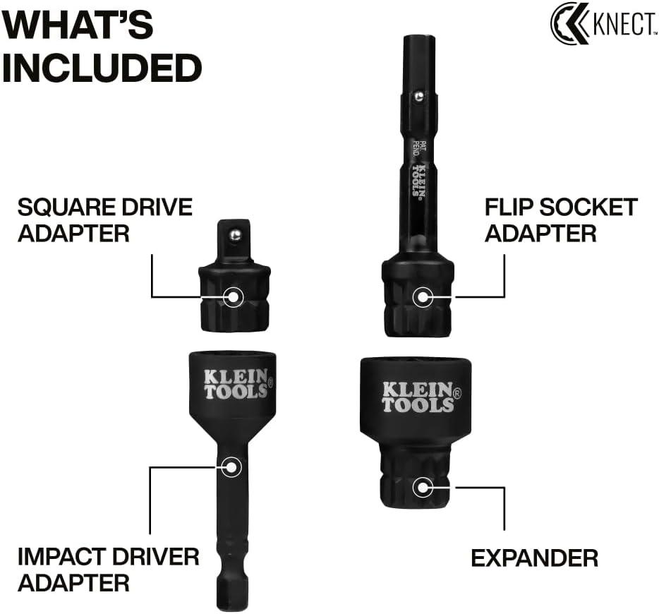 The Klein Tools KNECT system is an impact rated, cross-compatible driver and ratchet system for efficient driving tasks. The KNECT (M) Impact Socket Adapter Set includes four adapters: one connects 3/8-Inch sockets to ratchets and the KNECT (M) wrench, another lets KNECT (M) sockets work with a 1/4-Inch impact driver, a dual drive adapter links flip sockets to 3/8-Inch ratchets, and a reducer enables the KNECT (M) wrench to drive KNECT (S) sockets. For more than 160 years, Klein Tools has manufactured premium-quality, professional-grade hand tools that deliver the performance, durability and precision needed to get the job done right. Our family of engineers, workers and craftsman continue to put six generations of expertise into every tool we create by using only the highest quality materials, superior workmanship, and keeping manufacturing as close to home as we can. Klein isn't just the name of our company, it's also our family name. And since we're an American company that's family-owned and family-run, you know you can count on us to be here tomorrow. Klein Tools doesn't just make great products, we make great products that stand up to the demands of the professionals who use them every day … Since 1857.