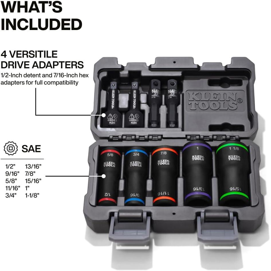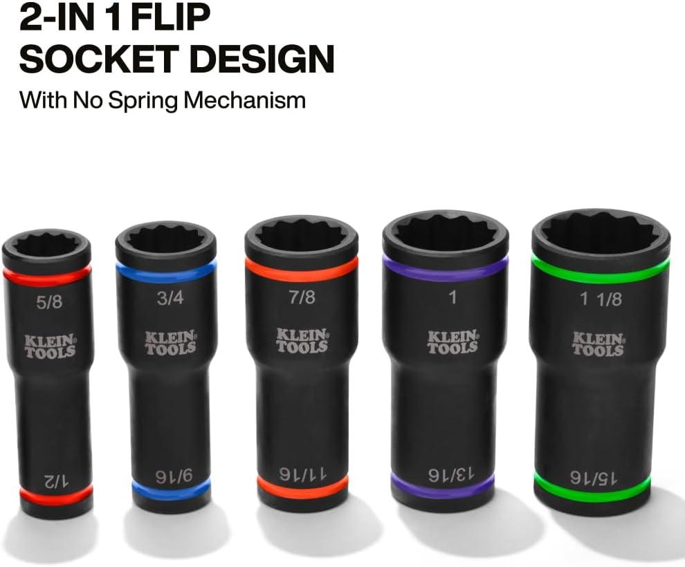Klein Tools 2-in-1 Impact Flip Socket Set features a durable, no-spring design and precision 12-point geometry for a secure, reliable grip. Its direct-flip mechanism allows seamless switching between socket sizes without extra parts or delays. Built for Linemen, it delivers the control and efficiency needed to power through tough jobs with confidence. For more than 160 years, Klein Tools has manufactured premium-quality, professional-grade hand tools that deliver the performance, durability and precision needed to get the job done right. Our family of engineers, workers and craftsman continue to put six generations of expertise into every tool we create by using only the highest quality materials, superior workmanship, and keeping manufacturing as close to home as we can. Klein isn't just the name of our company, it's also our family name. And since we're an American company that's family-owned and family-run, you know you can count on us to be here tomorrow. Klein Tools doesn't just make great products, we make great products that stand up to the demands of the professionals who use them every day … Since 1857.