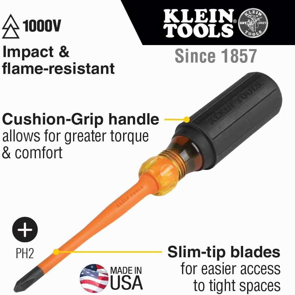 Klein Tools 6916INS 1000V Slim Tip Insulated Screwdriver, Made in USA, Screwdriver with 6-Inch Round Shank, 3/16-Inch Cabinet Tip, Cushion Grip Handle(#2 Phillips)