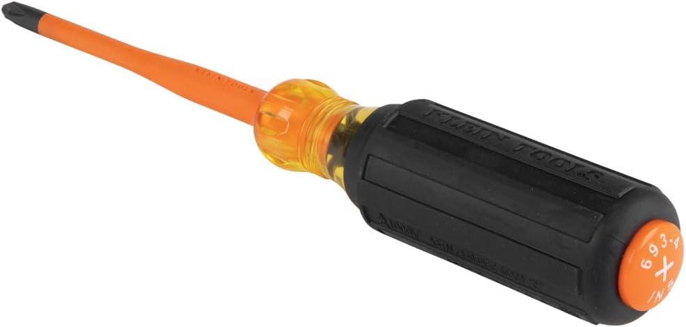 Klein Tools' Slim-Tip Insulated Screwdrivers have slim profile tips that allow for greater access into terminal blocks, slim-style breakers, or other tight spaces near energized sources. A bright orange coating of insulation protects from electrical shock, is flame and impact resistant, and sits flush with the tip helping to reduce insulation chipping and cracking. Klein insulated tools exceed the ASTM F1505 standards for insulated tools, and are clearly marked with the official 1000-Volt rating symbol. A must-have for any electrician's tool bag, these screwdrivers are available in 4-Inch round shank 1/4-Inch Cabinet tip and a #2 Phillips as well as 6-Inch round shank in a #2 Square tip.