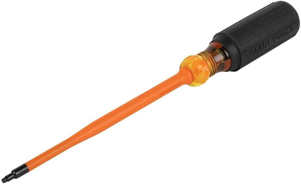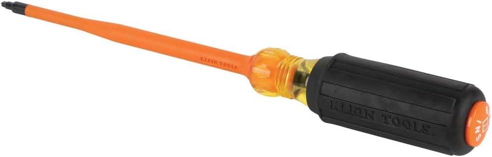 Klein Tools' Slim-Tip Insulated Screwdrivers have slim profile tips that allow for greater access into terminal blocks, slim-style breakers, or other tight spaces near energized sources. A bright orange coating of insulation protects from electrical shock, is flame and impact resistant, and sits flush with the tip helping to reduce insulation chipping and cracking. Klein insulated tools exceed the ASTM F1505 standards for insulated tools, and are clearly marked with the official 1000V rating symbol. A must-have for any electrician's tool bag, these screwdrivers are available in 4-Inch and 6-Inch lengths and a variety of tips.