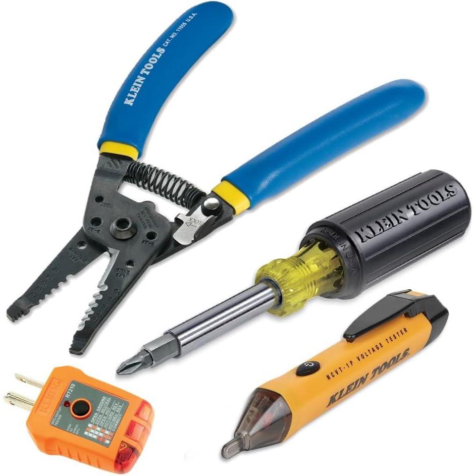 This 4-Piece Klein Tool Kit includes Wire Stripper, Multi-Bit Screwdriver / Nut Driver, Non-Contact Voltage Tester, GFCI Tester that is perfect for residential jobs. The compact, lightweight wire stripper and cutter cleanly cuts solid and stranded copper wire. The integrated screwdriver / nut driver shaft holds 8 popular tips and converts to 3 nut driver sizes. The Non-Contact Voltage Tester Pen detects standard voltage in cables, cords, circuit breakers, lighting fixtures, switches, outlets and wires. Receptacle Testers are designed to detect the most common wiring problems in standard and GFCI receptacles.