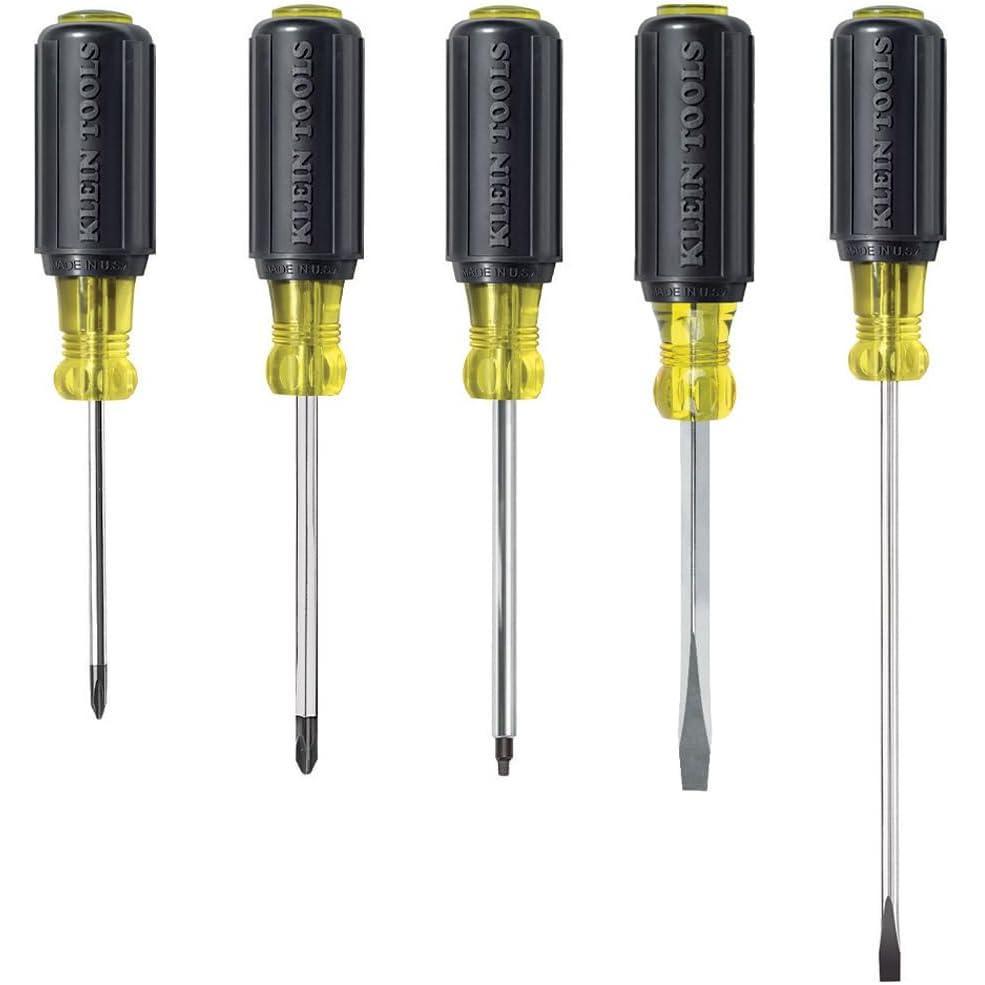 This 5-Piece Klein Tools Screwdriver set features a selection of frequently used screwdrivers. The Keystone-Tip Screwdrivers are designed for demanding applications with a bolster reinforced shank for hard use. Klein's 3/16-Inch Cabinet Tip Screwdriver features a narrow cabinet tip to make tight spaces easily acceptable. The #1 Phillips 3-Inch round Shank Screwdriver is precision-machined for an accurate fit and torque without slippage. Cushion-Grip handles allow for greater torque and comfort. #2 Square-Recess Tip Screwdriver features a 4-Inch shank. For more than 160 years, Klein Tools has manufactured premium-quality, professional-grade hand tools that deliver the performance, durability and precision needed to get the job done right. Our family of engineers, workers and craftsman continue to put six generations of expertise into every tool we create by using only the highest quality materials, superior workmanship, and keeping manufacturing as close to home as we can. Klein isn't just the name of our company, it's also our family name. And since we're an American company that's family-owned and family-run, you know you can count on us to be here tomorrow. Klein Tools doesn't just make great products, we make great products that stand up to the demands of the professionals who use them every day … Since 1857.