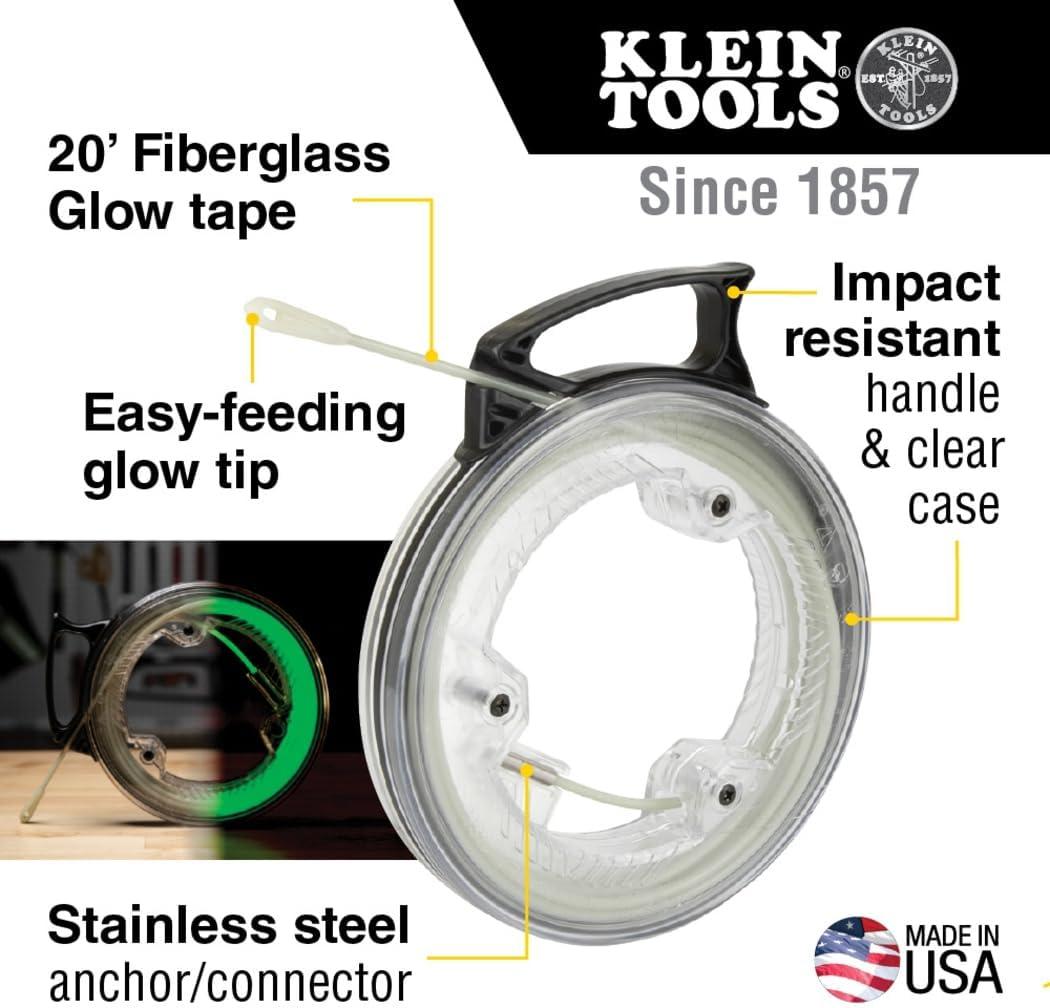This 6-Piece Klein Tools Glow Fish Tape Kit is perfect for wire runs associated with light commercial, and residential installations. The unique clear case permits ambient light to easily charge the glow tape and tip, providing a bright glow for use in low light. The illuminated fish rod tip from Klein Tools lights up for maximum visibility. For more than 160 years, Klein Tools has manufactured premium-quality, professional-grade hand tools that deliver the performance, durability and precision needed to get the job done right. Our family of engineers, workers and craftsman continue to put six generations of expertise into every tool we create by using only the highest quality materials, superior workmanship, and keeping manufacturing as close to home as we can. Klein isn't just the name of our company, it's also our family name. And since we're an American company that's family-owned and family-run, you know you can count on us to be here tomorrow. Klein Tools doesn't just make great products, we make great products that stand up to the demands of the professionals who use them every day … Since 1857.