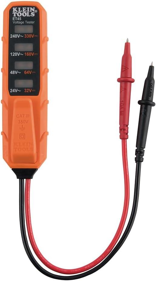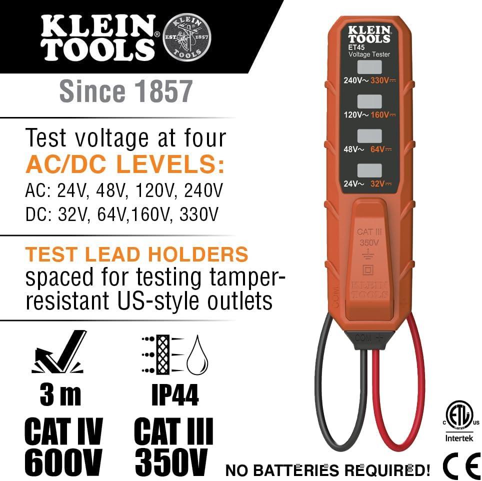 ELECTRONIC VOLTAGE TESTER is designed to test AC voltages from 24 to 240 VAC at four useful levels (Cat. No. ET45)