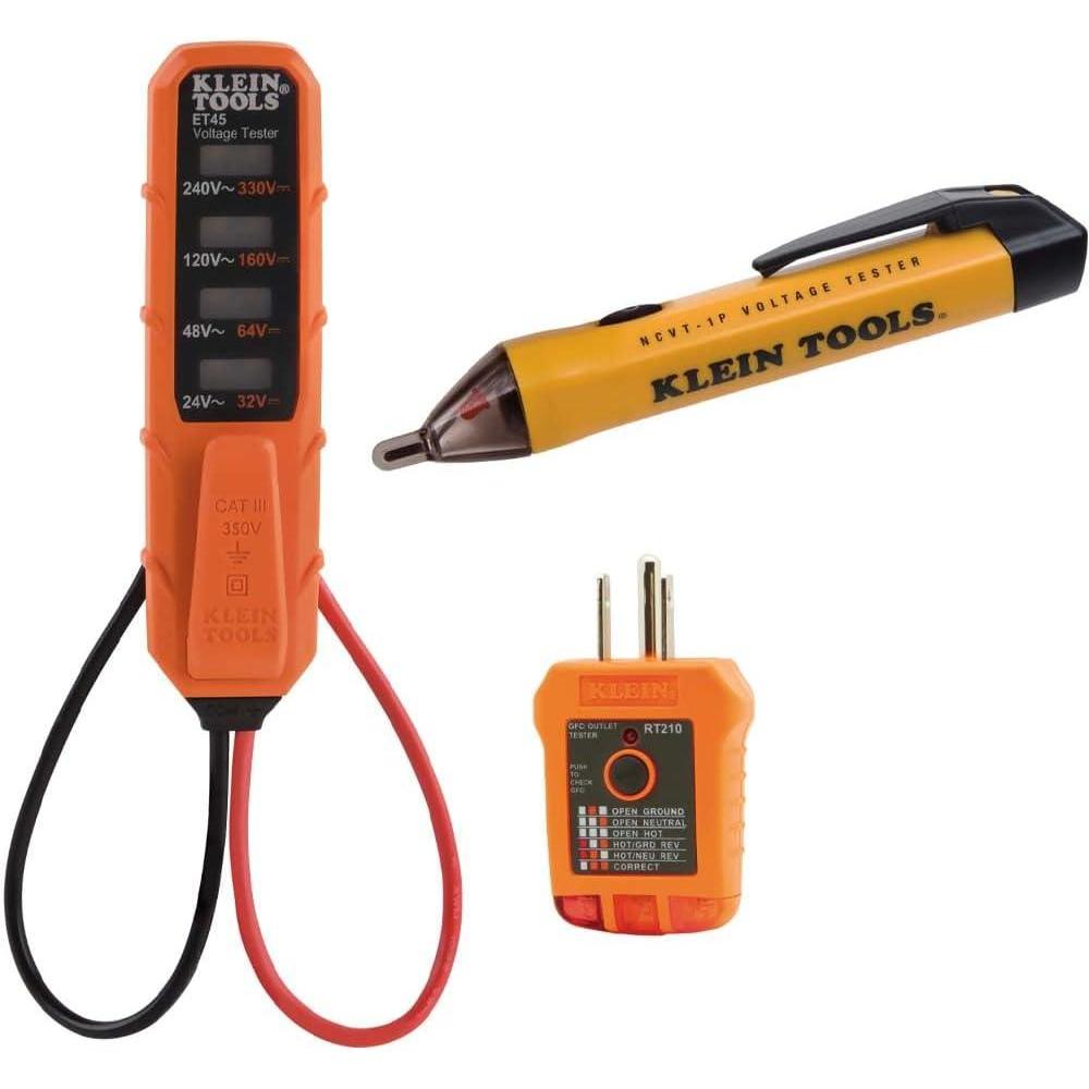 3-Piece Klein Tools Beginner Tester Kit is a great combination of electrical testers for any residential job. Non-Contact Voltage Tester detects standard voltage in cables, cords, circuit breakers, lighting fixtures, switches, non tamper-resistant outlets and wires. The receptacle tester is designed as a simple, easy to use tester to check, verify or troubleshoot common residential electrical wiring in electrical outlets, light fixtures, doorbells and more. The GFCI tester is designed to detect the most common wiring problems in standard and GFCI receptacles.
