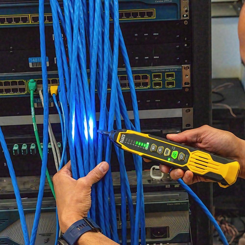 The Klein Tools includes the VDV501-770 Scout Pro Max Cable Tester and VDV500-223 Digital Probe-Pro Tracing Probe. The Scout Pro Max tests and troubleshoots RJ11, RJ12, RJ45, and F-connector terminated cables and provides analog and digital tone generation for cable tracing. It measures cable lengths (via TDR) and detects distance to faults. Use the Klein Tools Digital Tracing Probe with the Scout Pro Max Cable Tester to trace cables and wires on active and non-active networks.