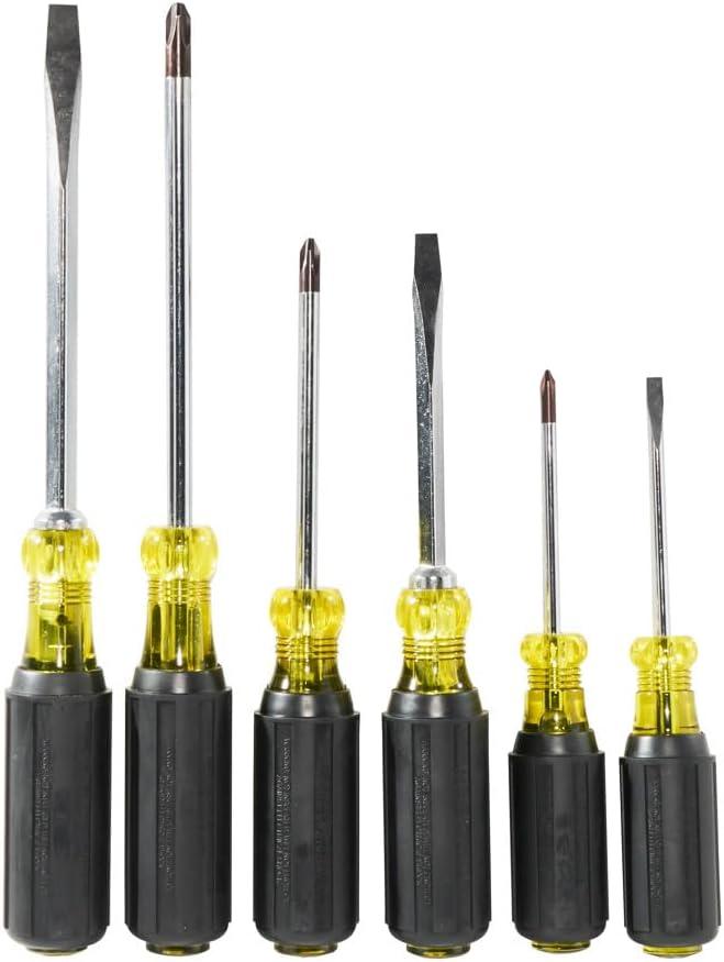 The Klein Tools 6-Piece Screwdriver Set with Slotted and Phillips drivers is the perfect general-purpose set of the most frequently used drivers. Included are, 3/16-Inch cabinet tip (601-3), 1/4-Inch and 5/16-Inch keystone tip (600-4 and 600-6), and #1, #2 and #3 Phillips tip (603-3, 603-4 and 603-6) screwdrivers. The premium chrome-plated drivers are heat treated for durability, and covered in cushioned grips for comfort. For more than 160 years, Klein Tools has manufactured premium-quality, professional-grade hand tools that deliver the performance, durability and precision needed to get the job done right. Our family of engineers, workers and craftsman continue to put six generations of expertise into every tool we create by using only the highest quality materials, superior workmanship, and keeping manufacturing as close to home as we can. Klein isn't just the name of our company, it's also our family name. And since we're an American company that's family-owned and family-run, you know you can count on us to be here tomorrow. Klein Tools doesn't just make great products, we make great products that stand up to the demands of the professionals who use them every day … Since 1857.