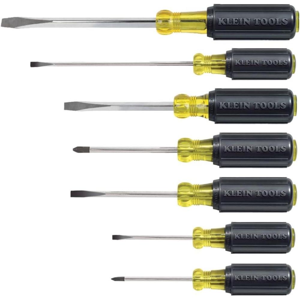 This 7-Piece Klein Tools Screwdriver Set contains the most frequently used, general purpose screwdrivers. Included are three cabinet-tip, two Phillips-tip, and two keystone-tip style screwdrivers. Each screwdriver features Klein's patented Tip-Ident which allows quick identification of the type of screwdriver and tip orientation. For more than 160 years, Klein Tools has manufactured premium-quality, professional-grade hand tools that deliver the performance, durability and precision needed to get the job done right. Our family of engineers, workers and craftsman continue to put six generations of expertise into every tool we create by using only the highest quality materials, superior workmanship, and keeping manufacturing as close to home as we can. Klein isn't just the name of our company, it's also our family name. And since we're an American company that's family-owned and family-run, you know you can count on us to be here tomorrow. Klein Tools doesn't just make great products, we make great products that stand up to the demands of the professionals who use them every day … Since 1857.