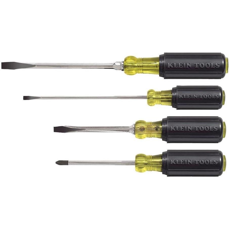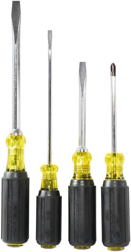 Klein Tools 4-Piece Cushion-Grip Screwdriver Set contains the type of screwdrivers professionals carry most often! Each screwdriver features a precision-machined tip for an exact fit. They also feature Kleins Cushion-Grip handle which provides greater torque and comfort. For more than 160 years, Klein Tools has manufactured premium-quality, professional-grade hand tools that deliver the performance, durability and precision needed to get the job done right. Our family of engineers, workers and craftsman continue to put six generations of expertise into every tool we create by using only the highest quality materials, superior workmanship, and keeping manufacturing as close to home as we can. Klein isn't just the name of our company, it's also our family name. And since we're an American company that's family-owned and family-run, you know you can count on us to be here tomorrow. Klein Tools doesn't just make great products, we make great products that stand up to the demands of the professionals who use them every day … Since 1857.