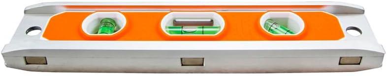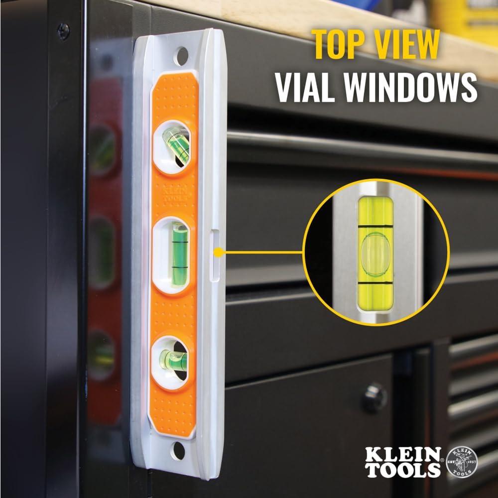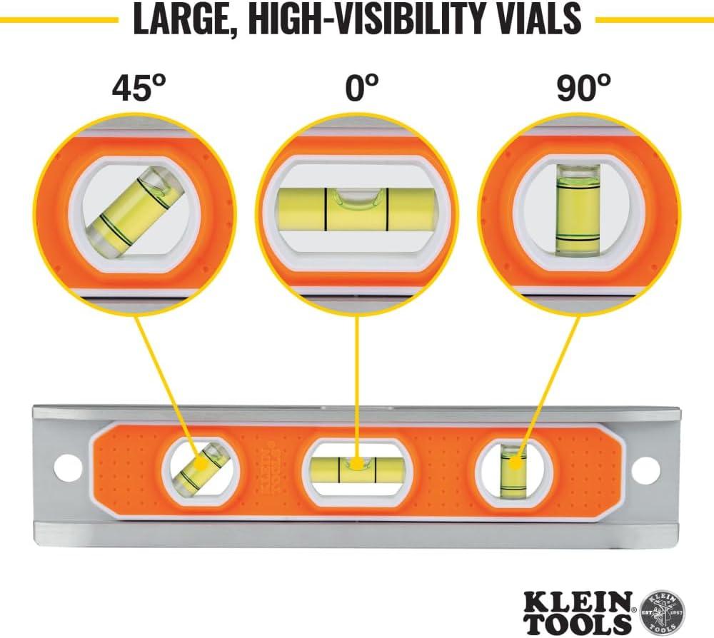 The Klein Tools 9-Inch Torpedo Level features a highly visible orange body with a rugged aluminum exterior that is easy to find in the clutter of jobsites or home projects. The large vials and windows combine to make a level that is exceptionally easy to read in many different projects, from carpentry to plumbing, and more. The magnetic base is powerful and secures to any magnetic surface. The included V-groove allows the level to snugly fit onto conduit, pipe, railings, and any other round surface.